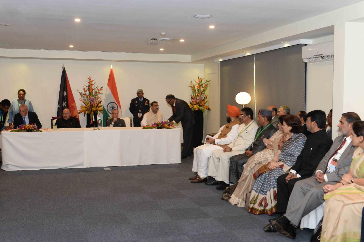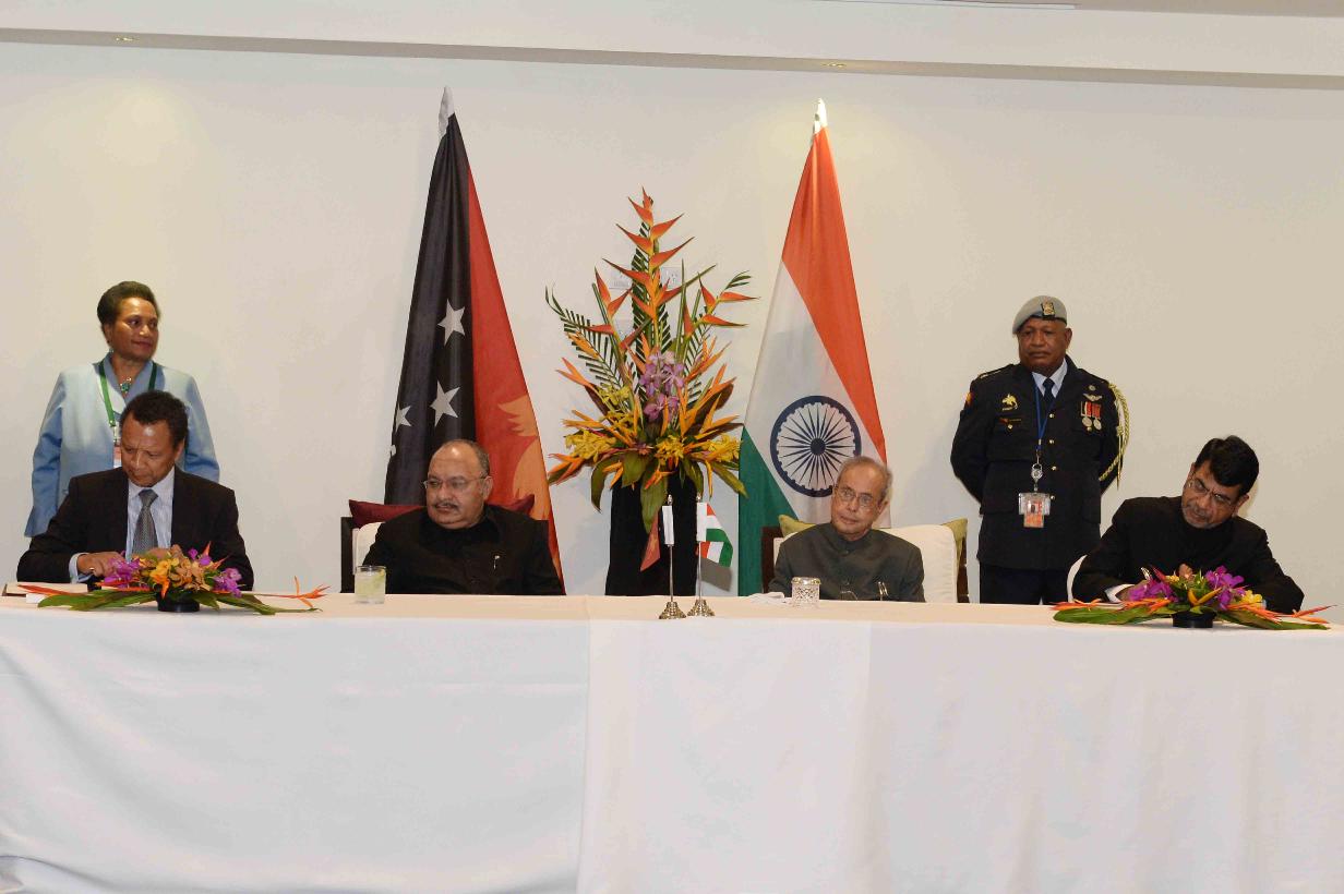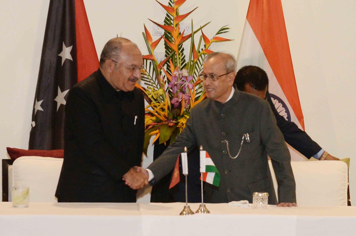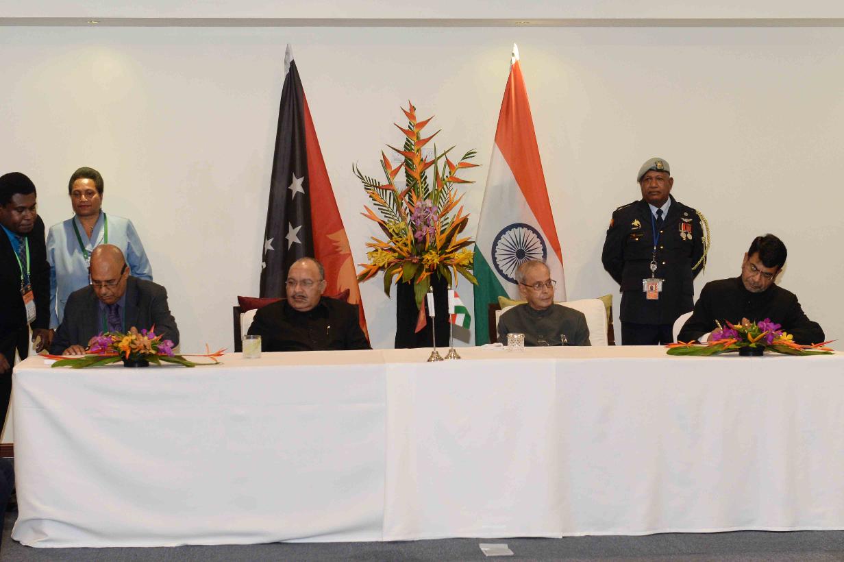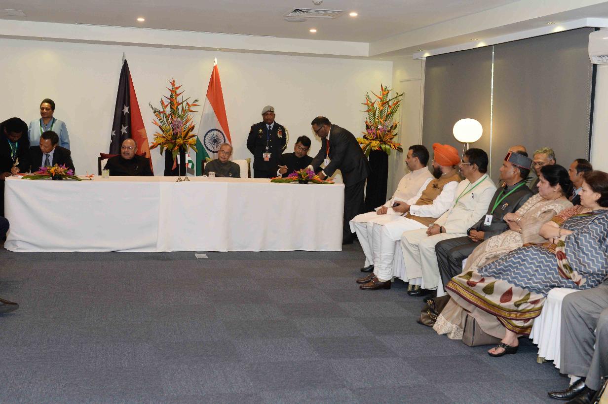 | Caption: | The President of India, Shri Pranab Mukherjee and the Prime Minister of Papua New Guinea, Hon. Mr. Peter O Neill witnessing the various Signing of Agreements/MOUs between India and Papua New Guinea, at Port Moresby, in Papua New Guinea on April 29, 2016. |