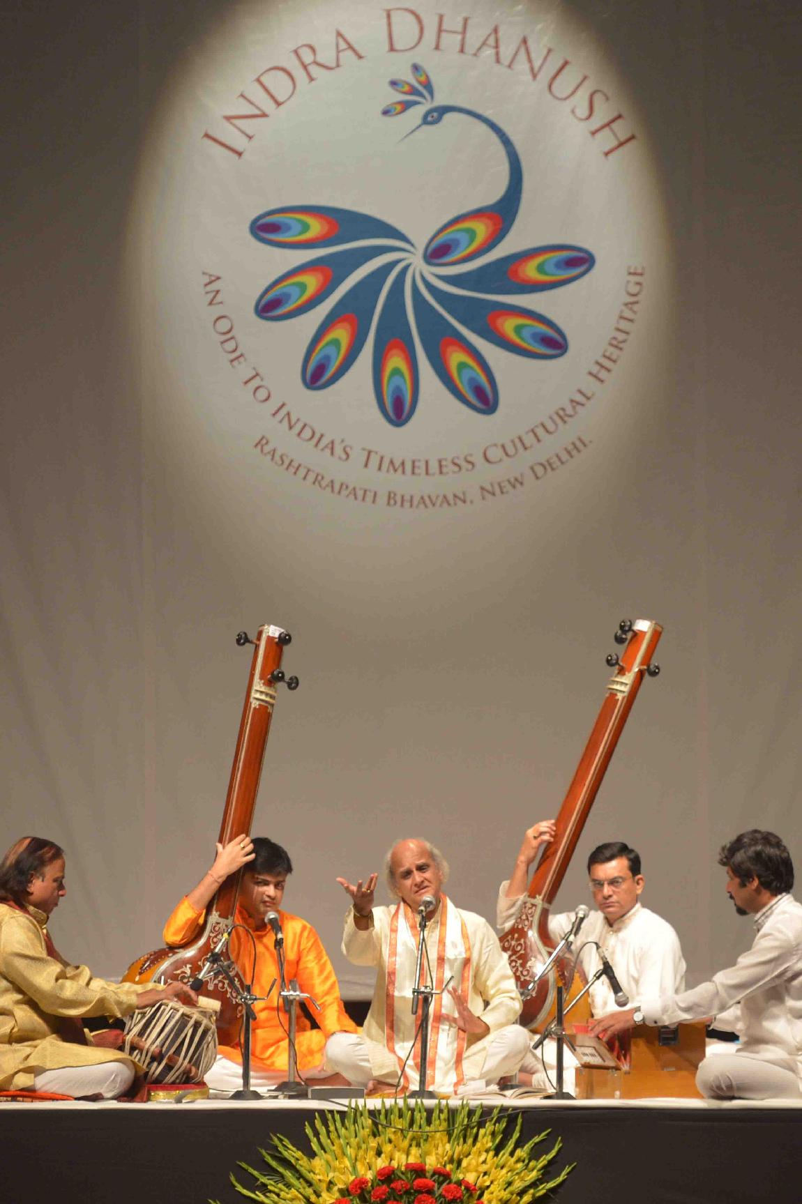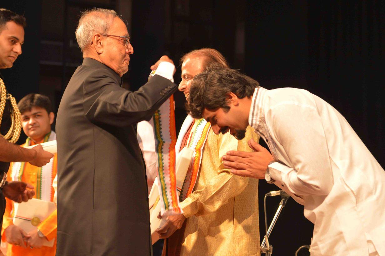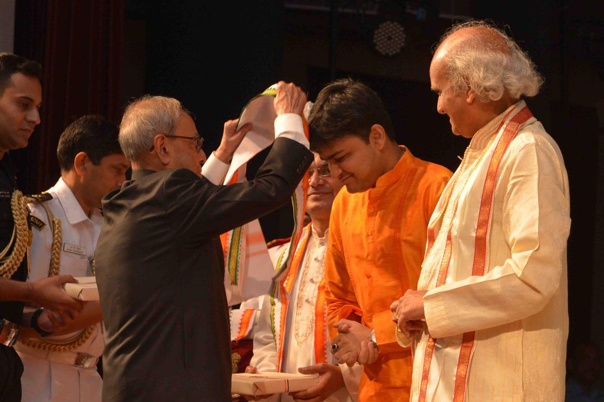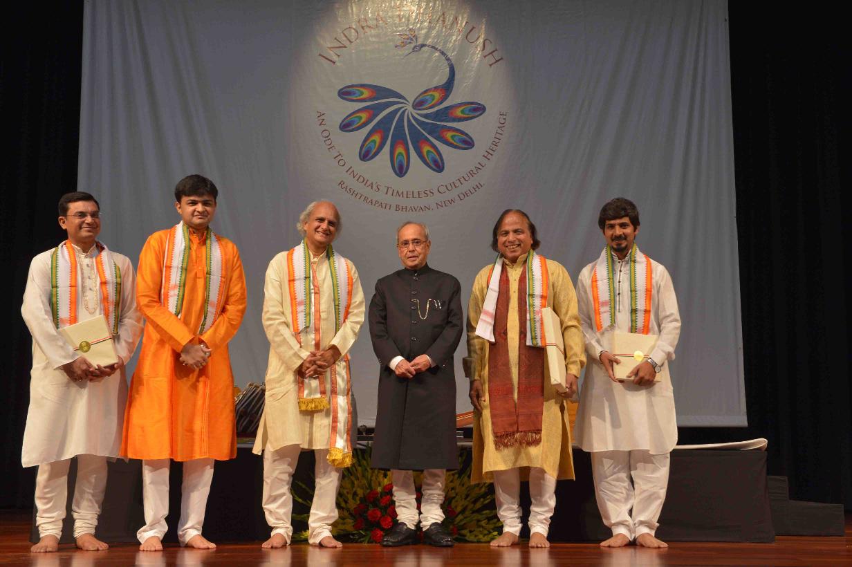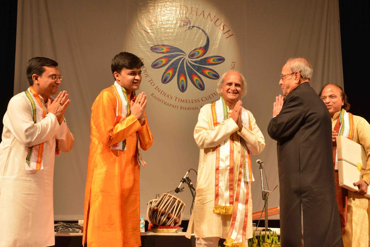 | Caption: | The President of India, Shri Pranab Mukherjee felicitating the artists after witnessing a performance by Shri Ulhas Kashalkar at Rashtrpati Bhavan Auditorium on May 07, 2016. |