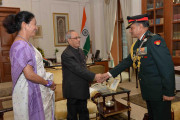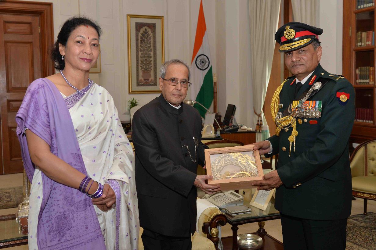 | Caption: | The President of India, Shri Pranab Mukherjee meeting with Lt. Gen G.S. Bisht, VSM, ADC, Director General, Land Works & Environment, QMG Branch & Hony ADC to the President along with Smt. Radha Bisht, at Rashtrapati Bhavan on January 13, 2016. |