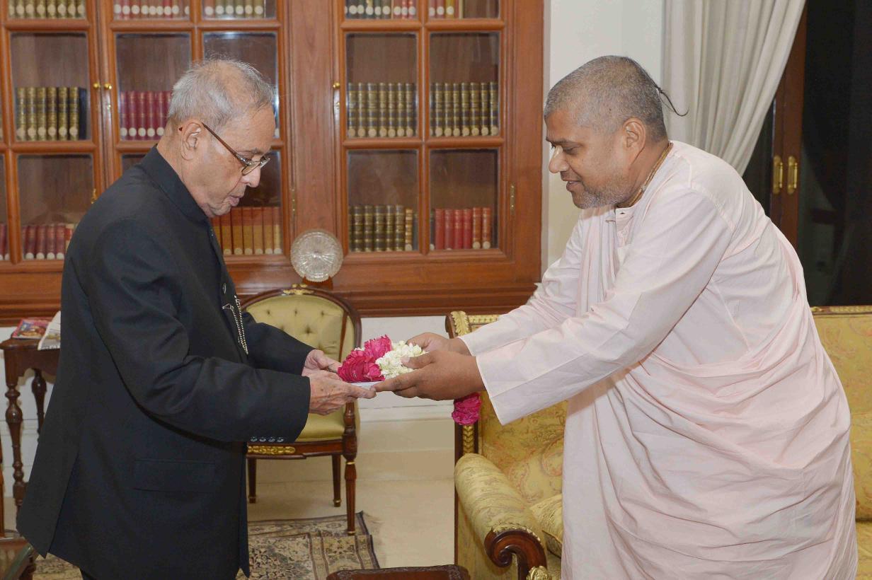 | Caption: | The President of India, Shri Pranab Mukherjee meeting with Shri BS Sanyasi Maharaj, General Secretary, Gaudiya Mission, Kolkata, at Rashtrapati Bhavan on April 13, 2016. |