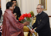 | Caption: | The President of India, Shri Pranab Mukherjee receiving Greetings from the Speaker of Lok Sabha, Smt Meira Kumar on the occasion of New Year 2014 at Rashtrapati Bhavan in New Delhi on Jan 01, 2014 |