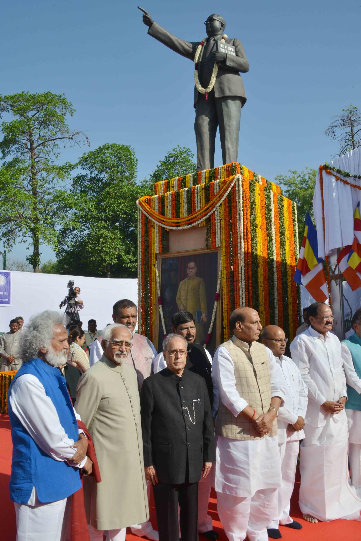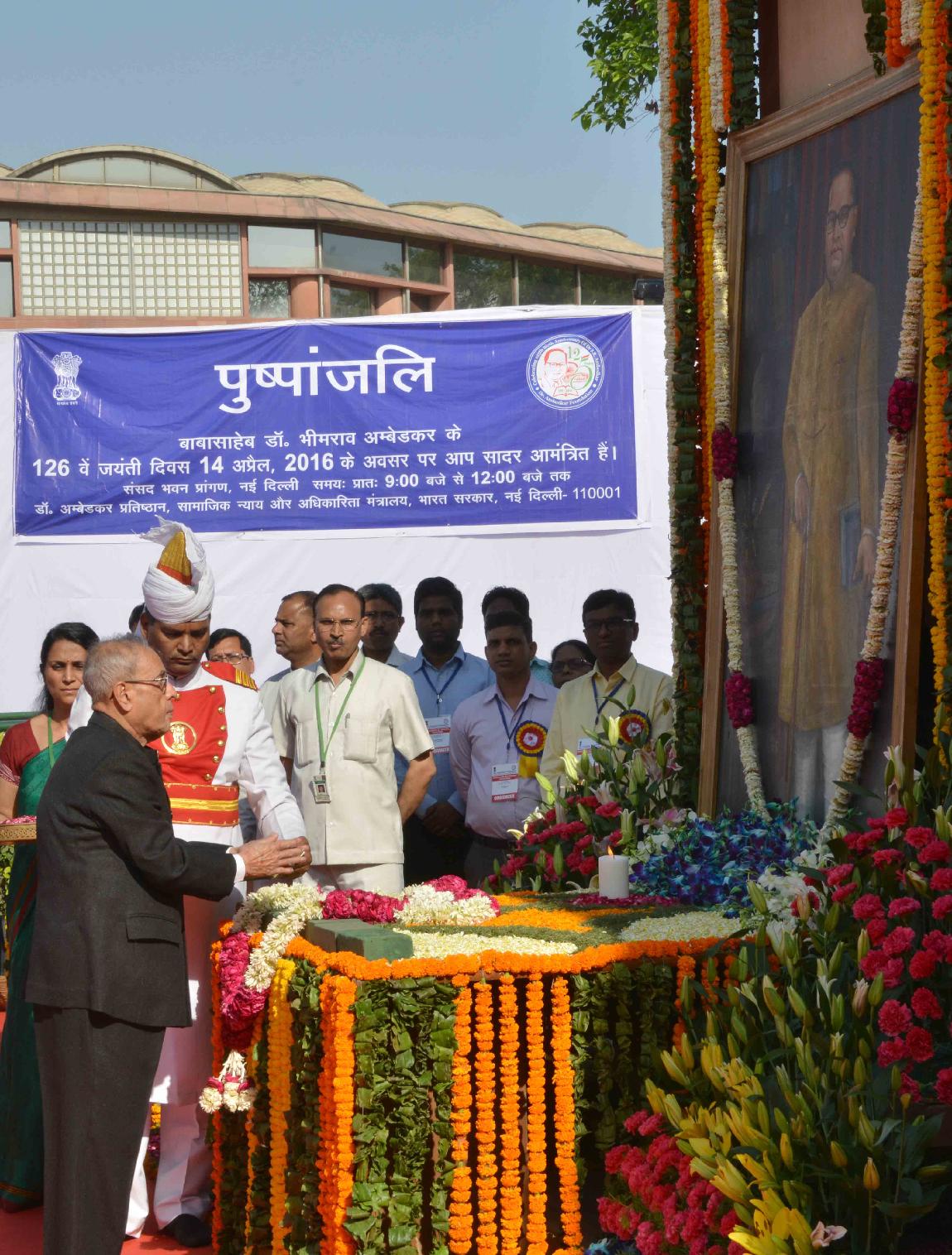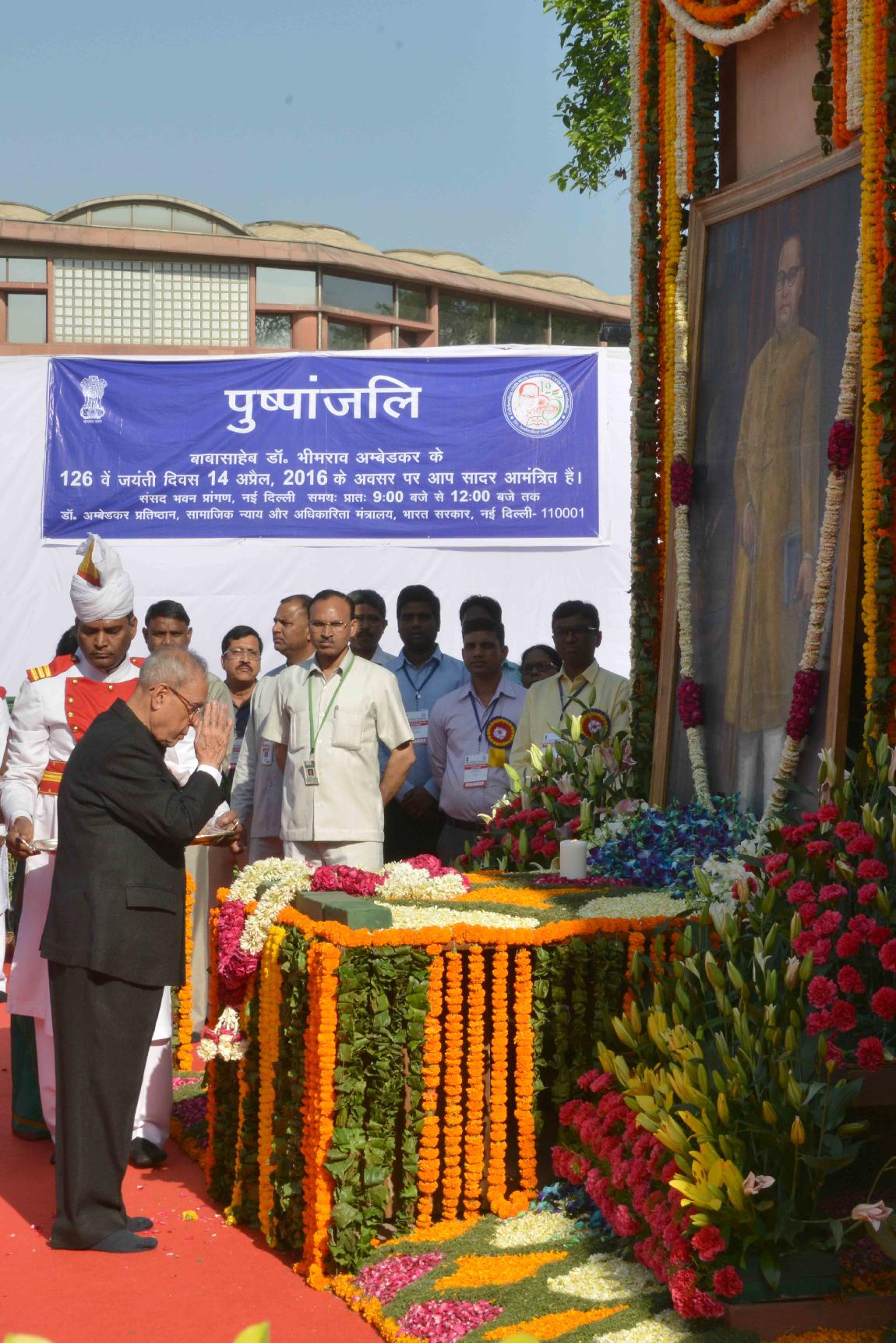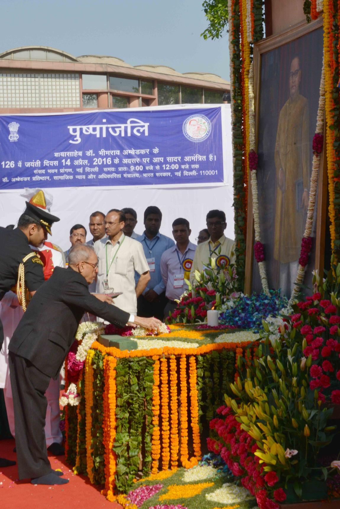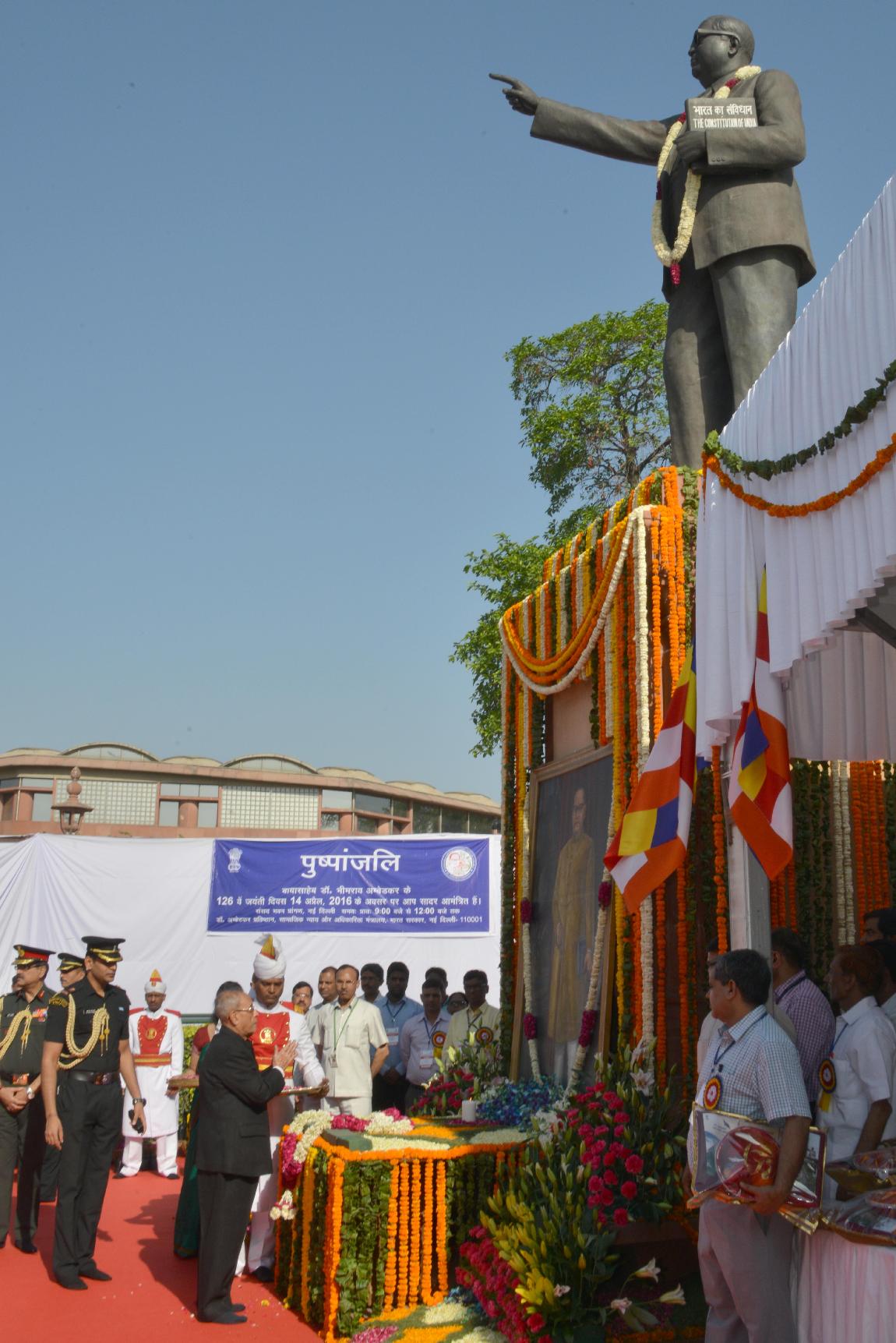 | Caption: | The President of India, Shri Pranab Mukherjee paying floral tributes at the statue of Babasaheb Dr. BR Ambedkar on the occasion of his 125th Birth Anniversary, in New Delhi on April 14, 2016. |