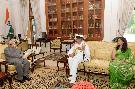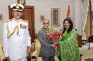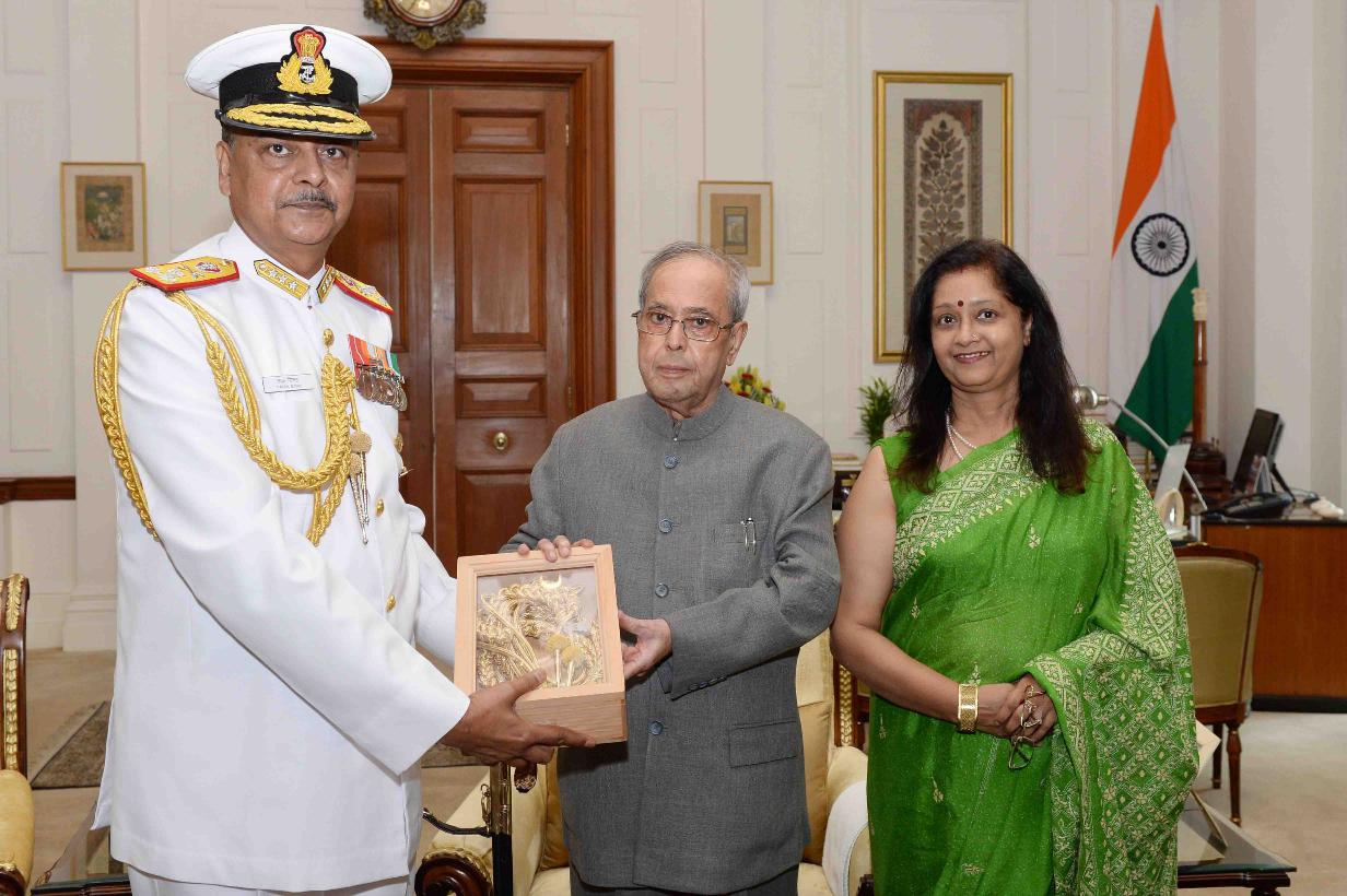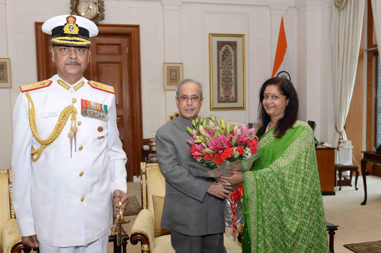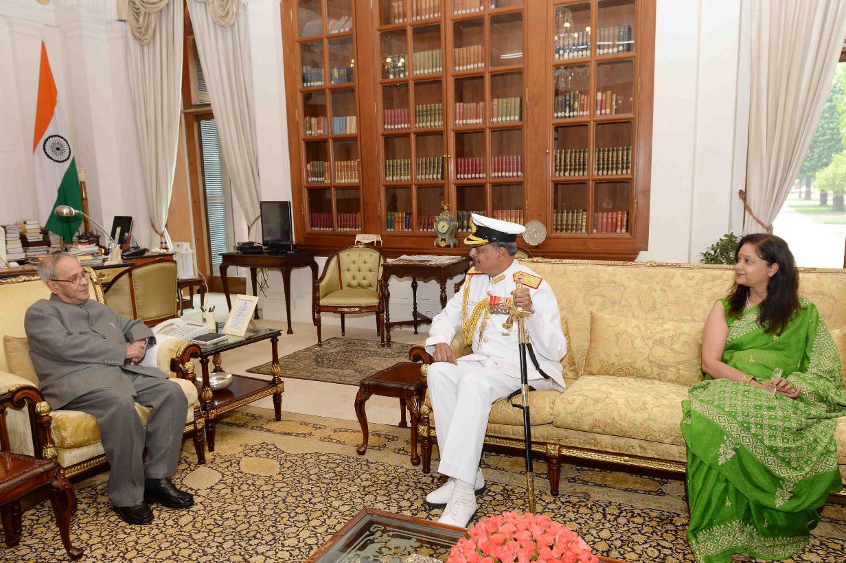 | Caption: | The President of India, Shri Pranab Mukherjee meeting with Surg Vice Admiral Tapan Sinha, SM, PHS, DGMS (Navy) & Hony Surgeon to the President alongwith Smt. Sujata Sinha, at Rashtrapati Bhavan on May 09, 2016. |