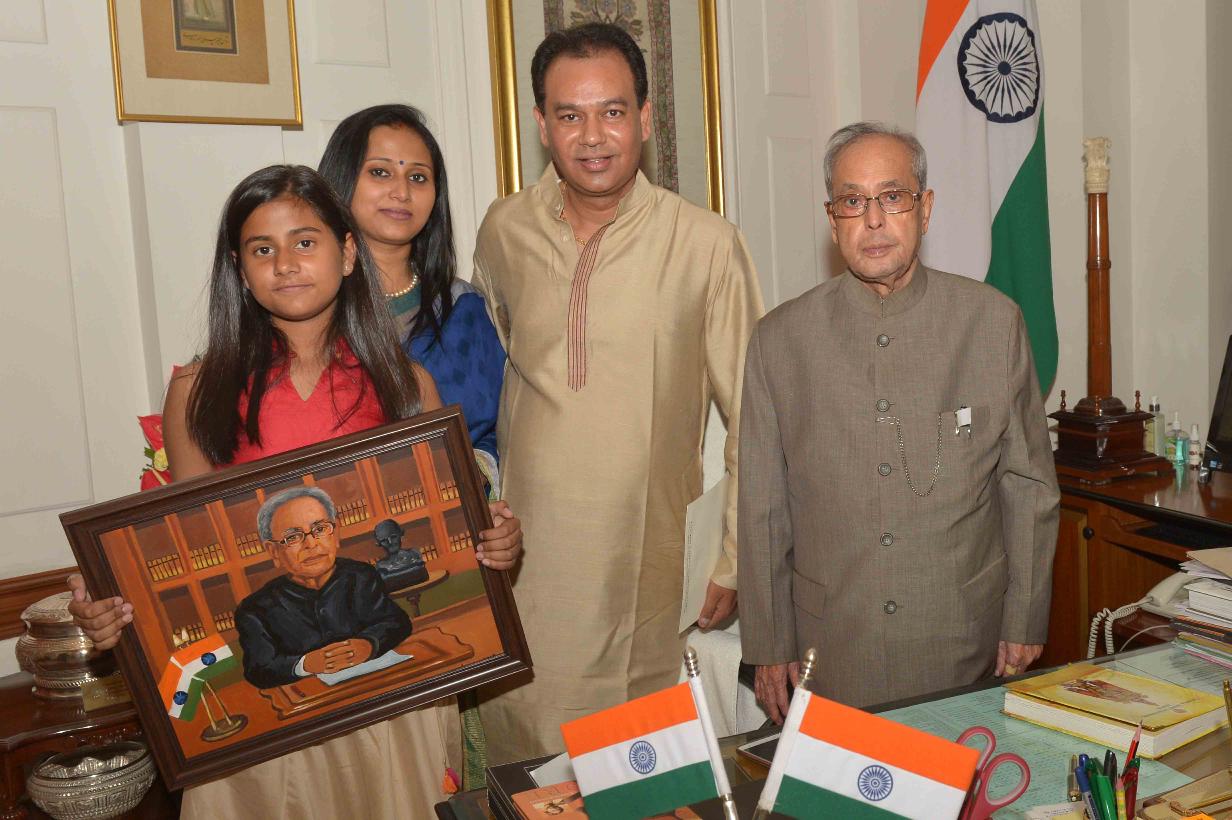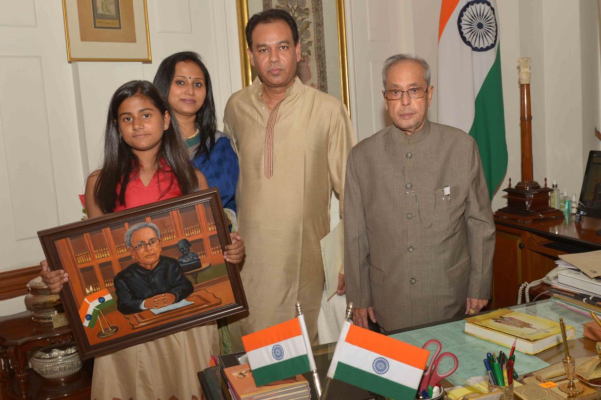 | Caption: | The President of India, Shri Pranab Mukherjee being greeted by Shri Debashis Saha, Hony Treasurer, Aeronautical Society of India alongwith Ms. Tanushree Dasgupta Saha and Ms. Anish Mitra on the occasion of Poila Baisakh, at Rashtrapati Bhavan on April 14, 2016. |