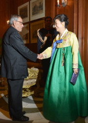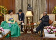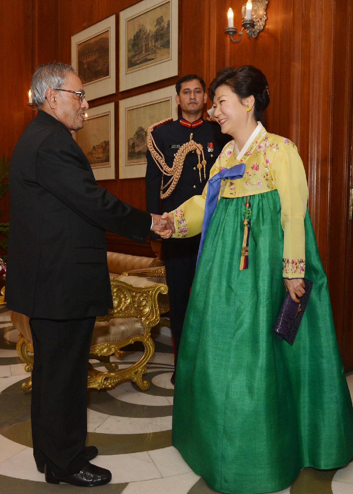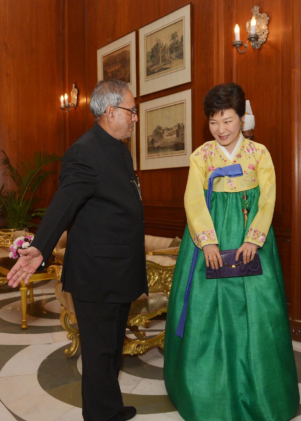 | Caption: | The President of the Republic of Korea, Her Excellency Park Geun-Hye calling on the President of India, Shri Pranab Mukherjee at Rashtrapati Bhavan in New Delhi on Jan 16, 2014 |