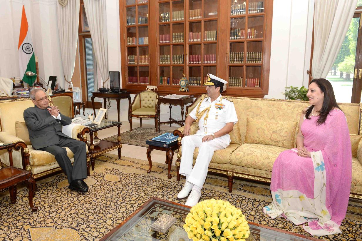 | Caption: | The President of India, Shri Pranab Mukherjee meeting with Admiral R.K. Dhowan, Chief of the Naval Staff and Smt. Minu Dhowan, during a farewell call, at Rashtrapati Bhavan on May 18, 2016. |
