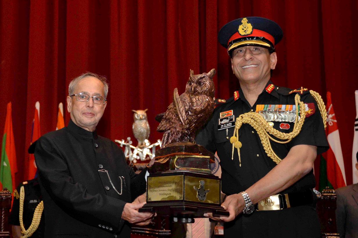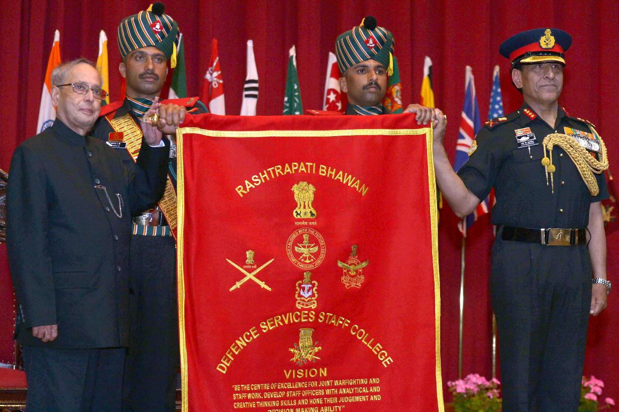 | Caption: | The President of India, Shri Pranab Mukherjee being presented the Banner & Memento by Lt. Gen. SK Gadeock, Commandant DSSC, at the Convocation of the 71st Staff Course of Defence Services Staff College (DSSC), at Wellington, Nilgiris in Tamil Nadu on April 15, 2016. |
