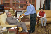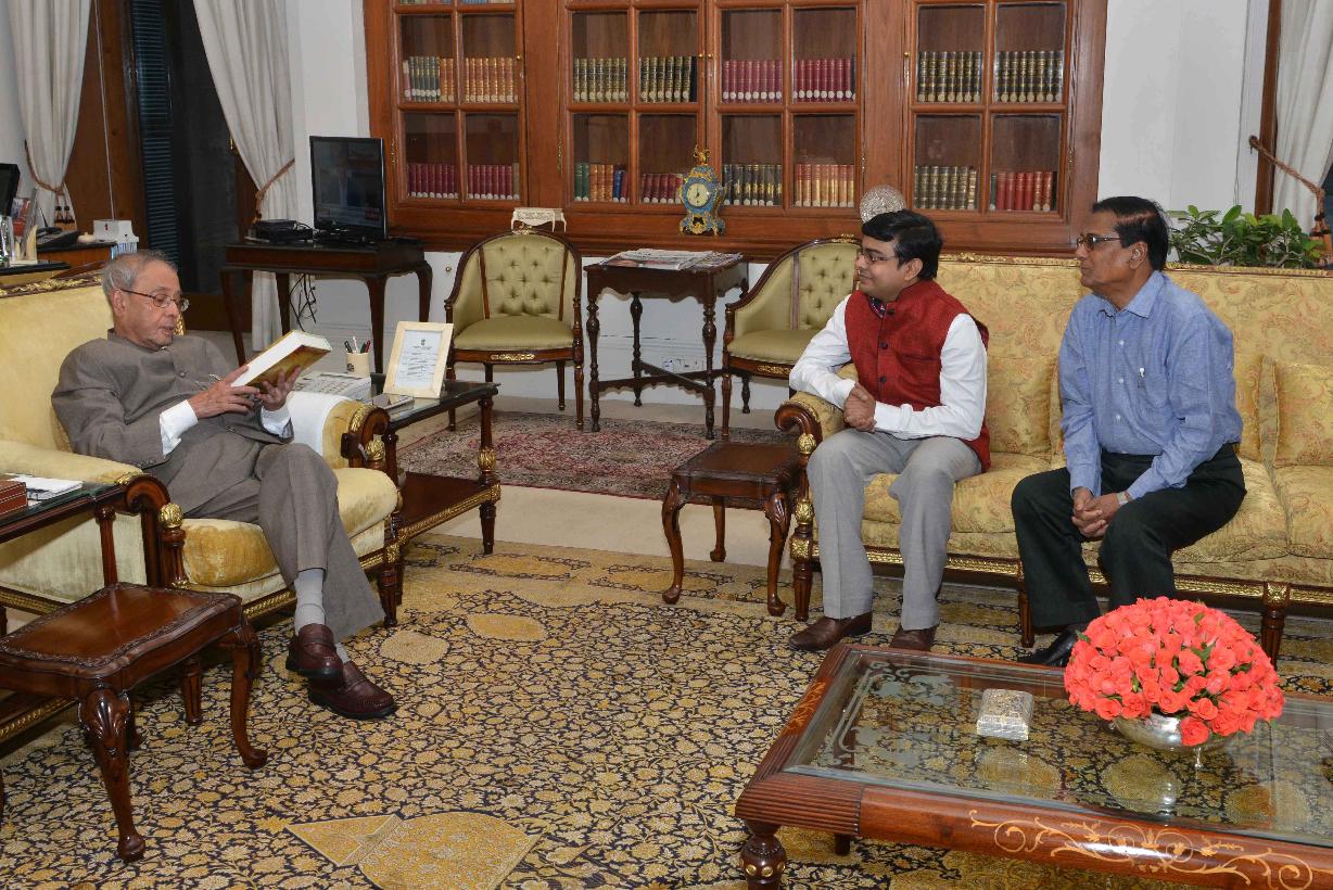 | Caption: | The President of India, Shri Pranab Mukherjee receiving a book ''Antardrishti te Satyao ke Dekha-Ek Sampadak-er Jibon Charchya'' from Shri Upen Chakraborty and Shri D. Mondal from Kolkata, at Rashtrapati Bhavan on May 20, 2016. |