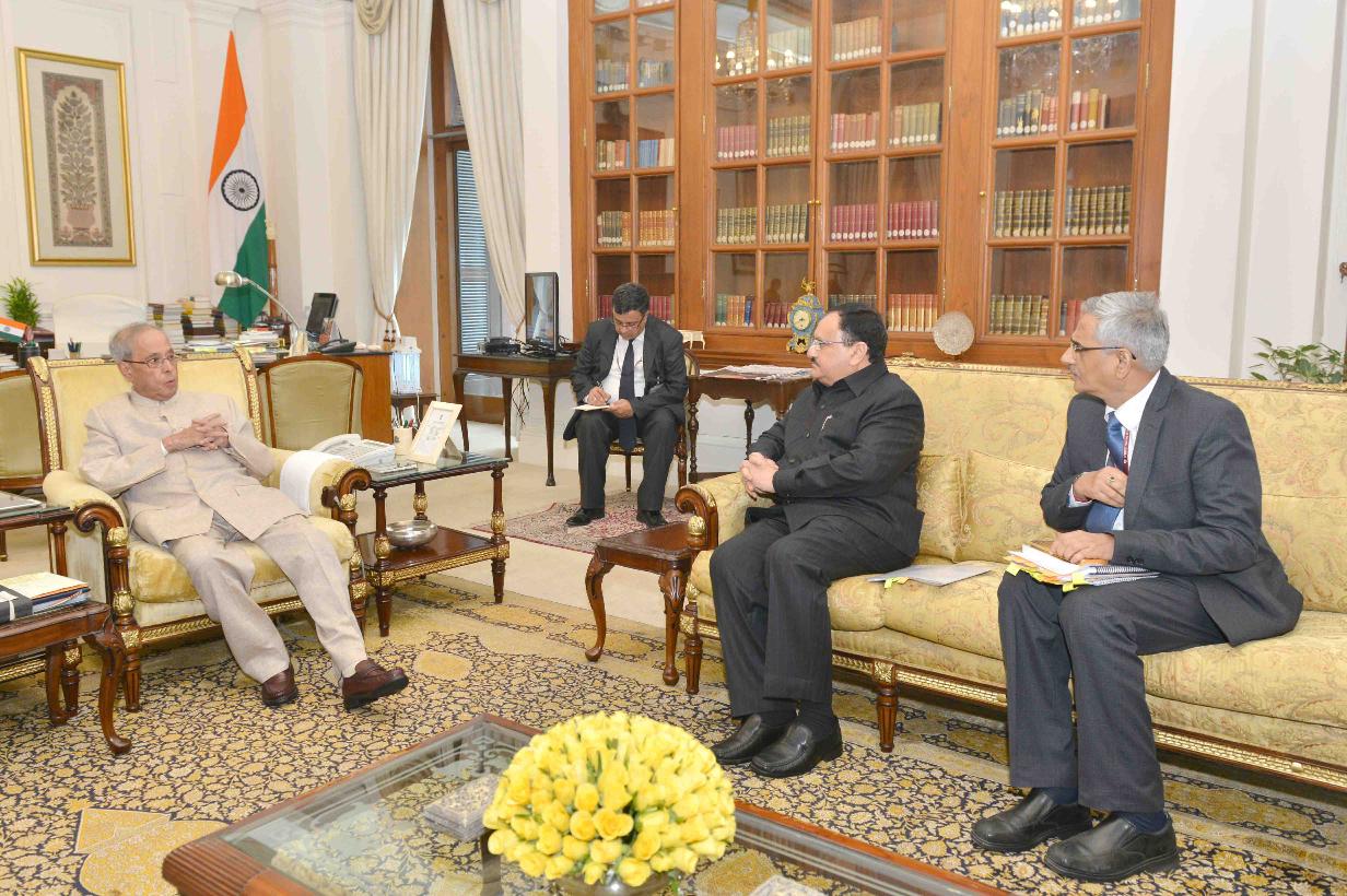 | Caption: | The President of India, Shri Pranab Mukherjee meeting with Shri J.P. Nadda, Minister of Health & Family Welfare along with Shri B.P. Sharma, Health Secretary, at Rashtrapati Bhavan on May 23, 2016. |