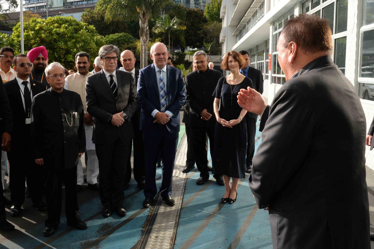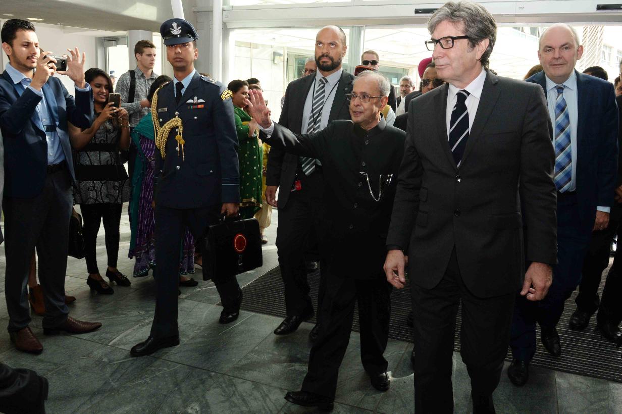 | Caption: | The President of India, Shri Pranab Mukherjee being welcomed by Mr. Steven Joyce, Minister for Nursery Education and Economic Development of New Zealand and Professor Mr. Derek Mc Cormick, Vice Chancellor of AUT, at Auckland University of Technology, at Auckland, in New Zealand on May 02, 2016. |