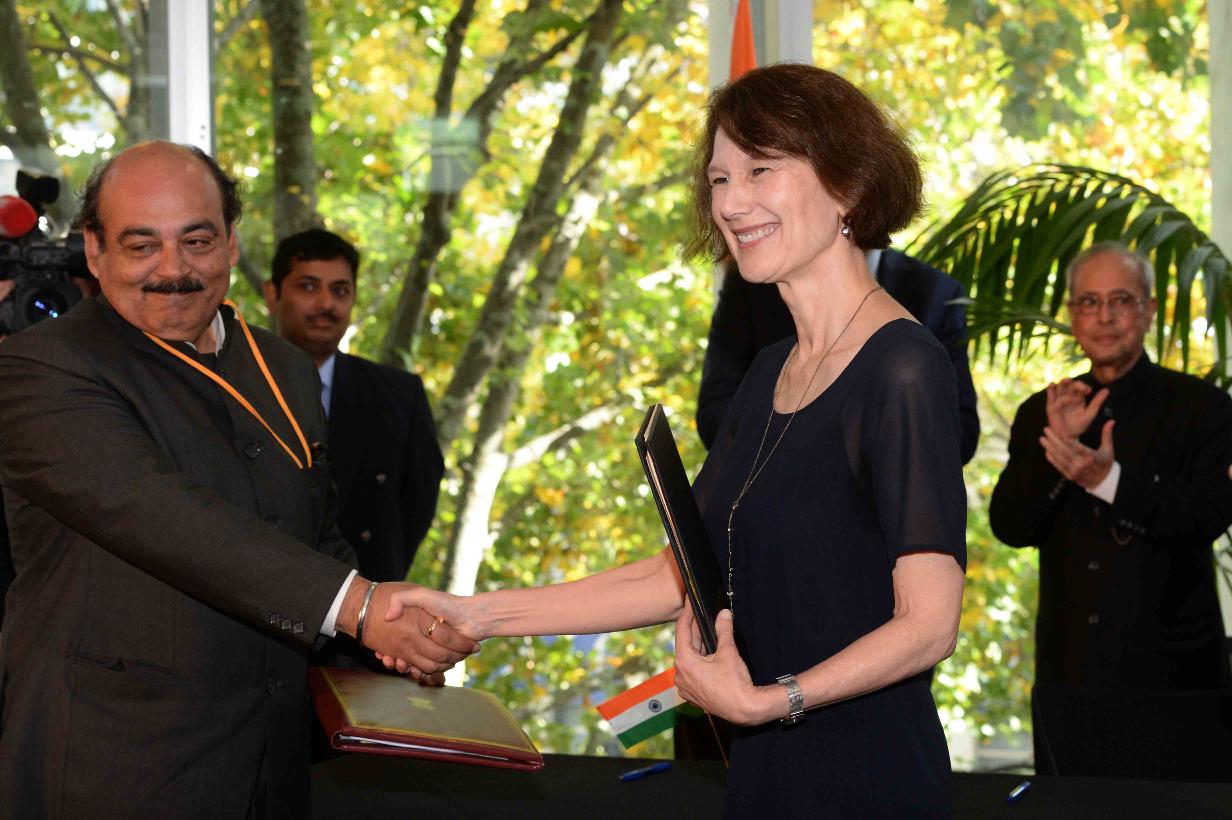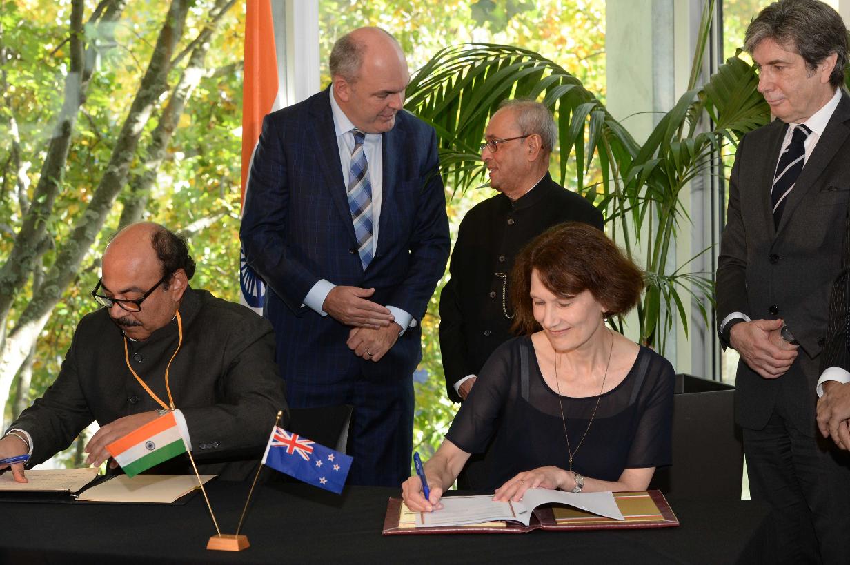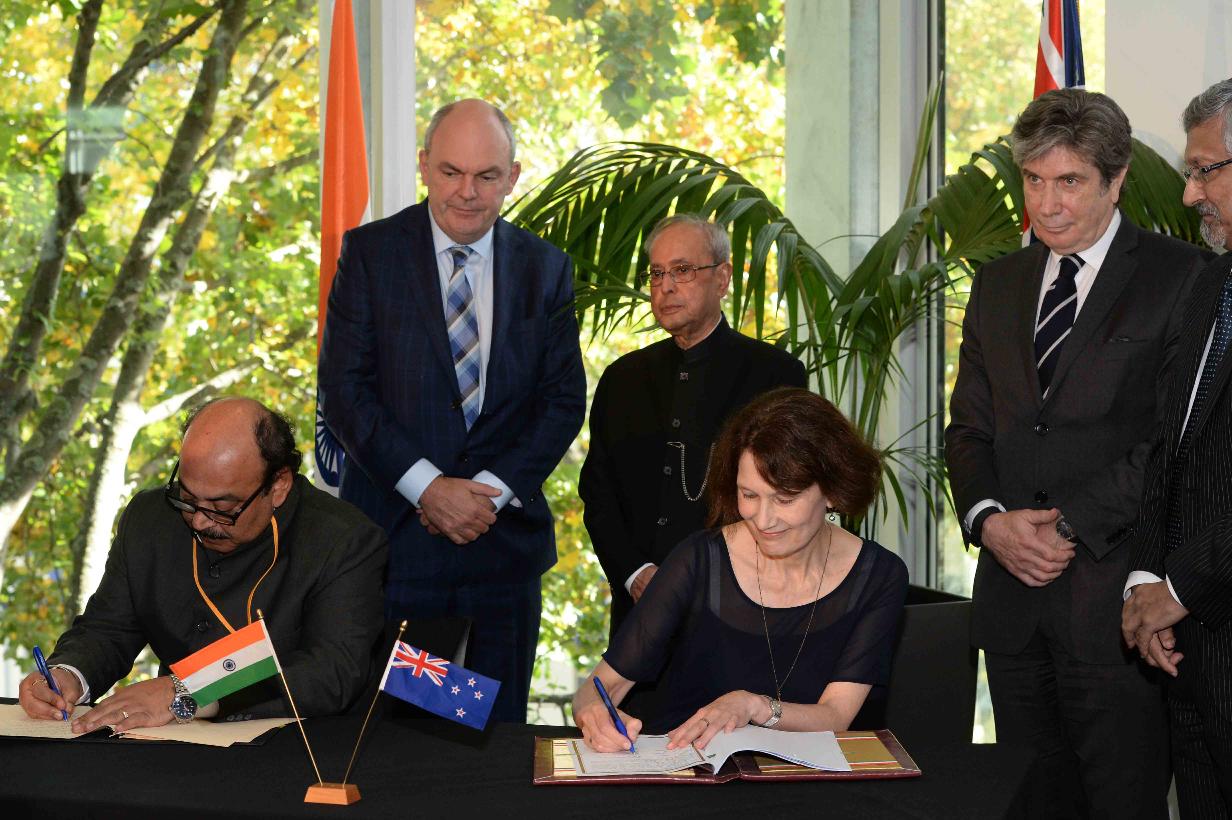 | Caption: | The President of India, Shri Pranab Mukherjee and the Minister for Nursery and Economic Development of New Zealand, Mr. Steven Joyce witnessing the signing of MOU of ICCR Chair at Victoria University, at Auckland, in New Zealand on May 02, 2016. |