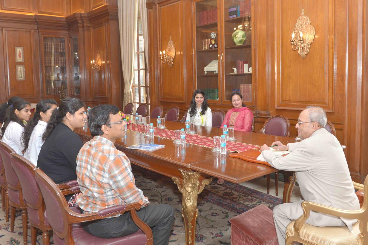 | Caption: | The President of India, Shri Pranab Mukherjee meeting with Bro. Monachan K.K., Principal alongwith Ms. Sukriti Gupta, All India Topper of CBSE Class XII with other students and teachers from Montfort School, Delhi, at Rashtrapati Bhavan on May 30, 2016. |