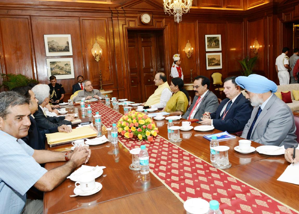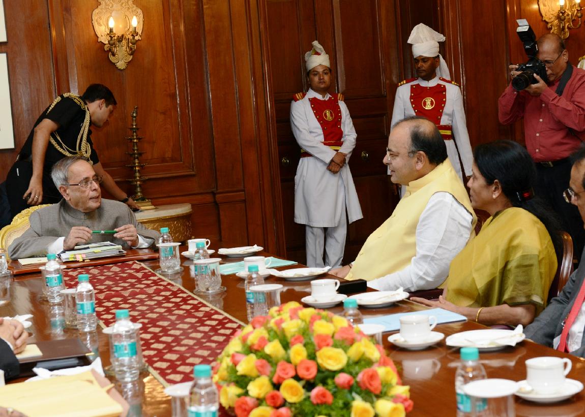 | Caption: | The President of India, Shri Pranab Mukherjee meeting with the Minister of Finance, Shri Arun Jaitley , MOS (Finance), Smt Nirmala Sitharaman and other distinguished officer at Rashtrapati Bhavan in New Delhi on July 10, 2014 |