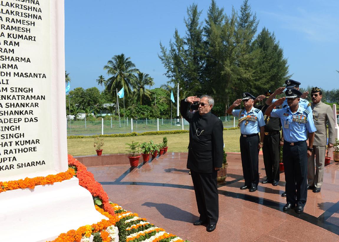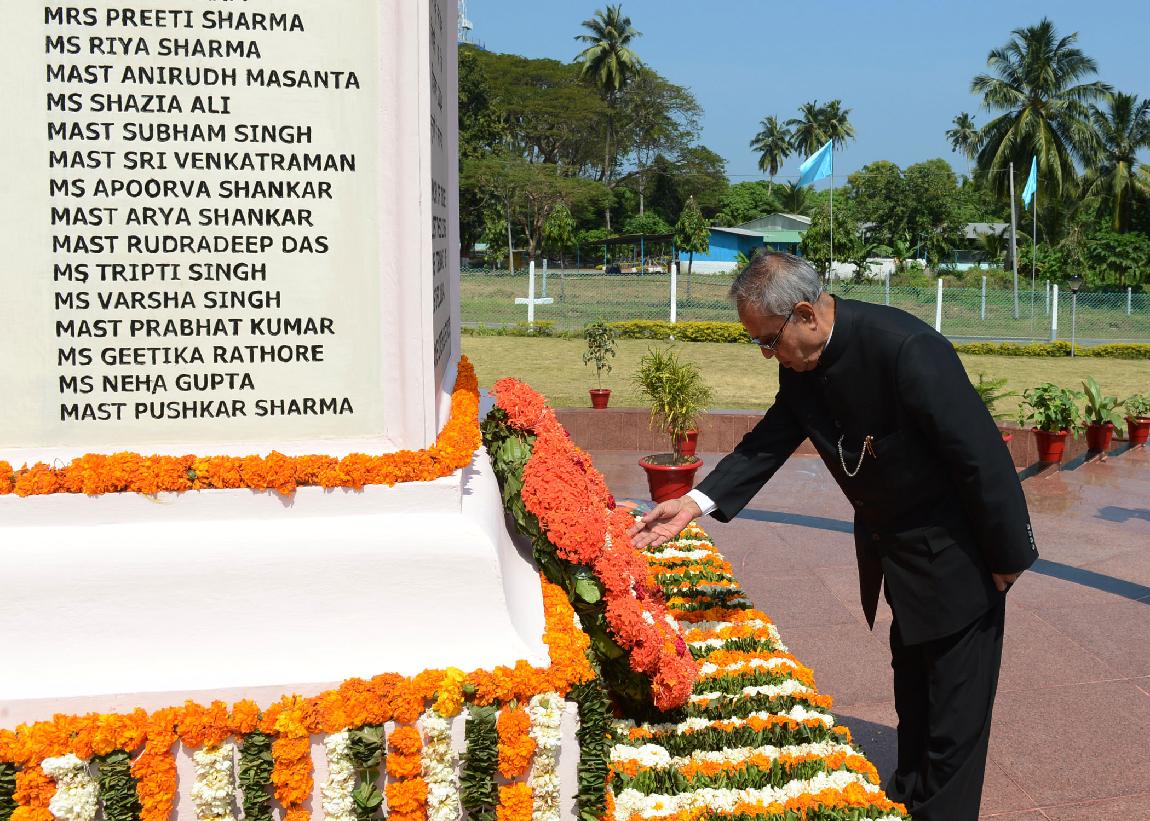 | Caption: | The President of India, Shri Pranab Mukherjee laying wreath at IAF Tsunami Memorial at Car Nicobar in Andaman and Nicobar on Jan 13, 2014 |