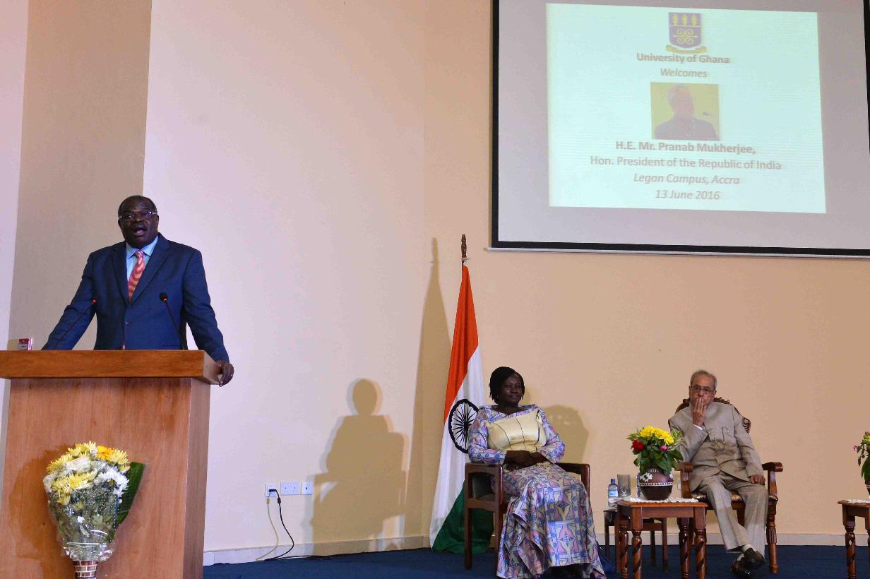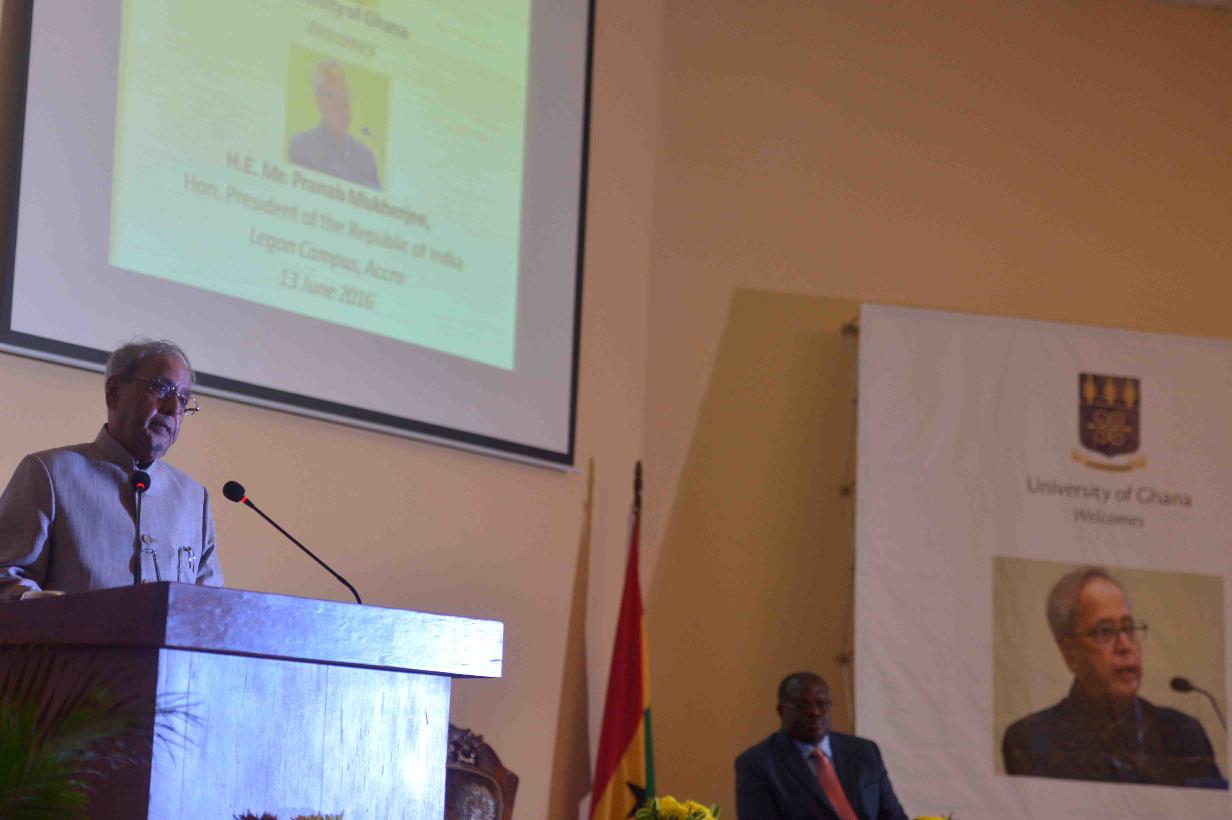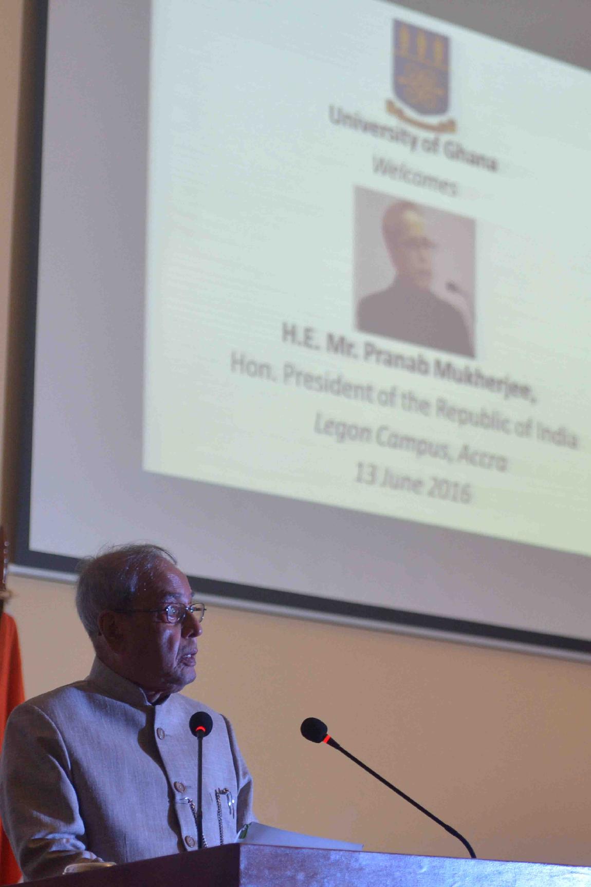 | Caption: | The President of India, Shri Pranab Mukherjee delivering his speech during his visit at Institute of Statistical, Social & Economic Research, in Accra, Ghana on June 13, 2016. |