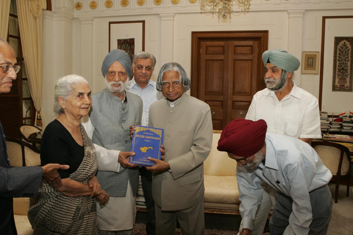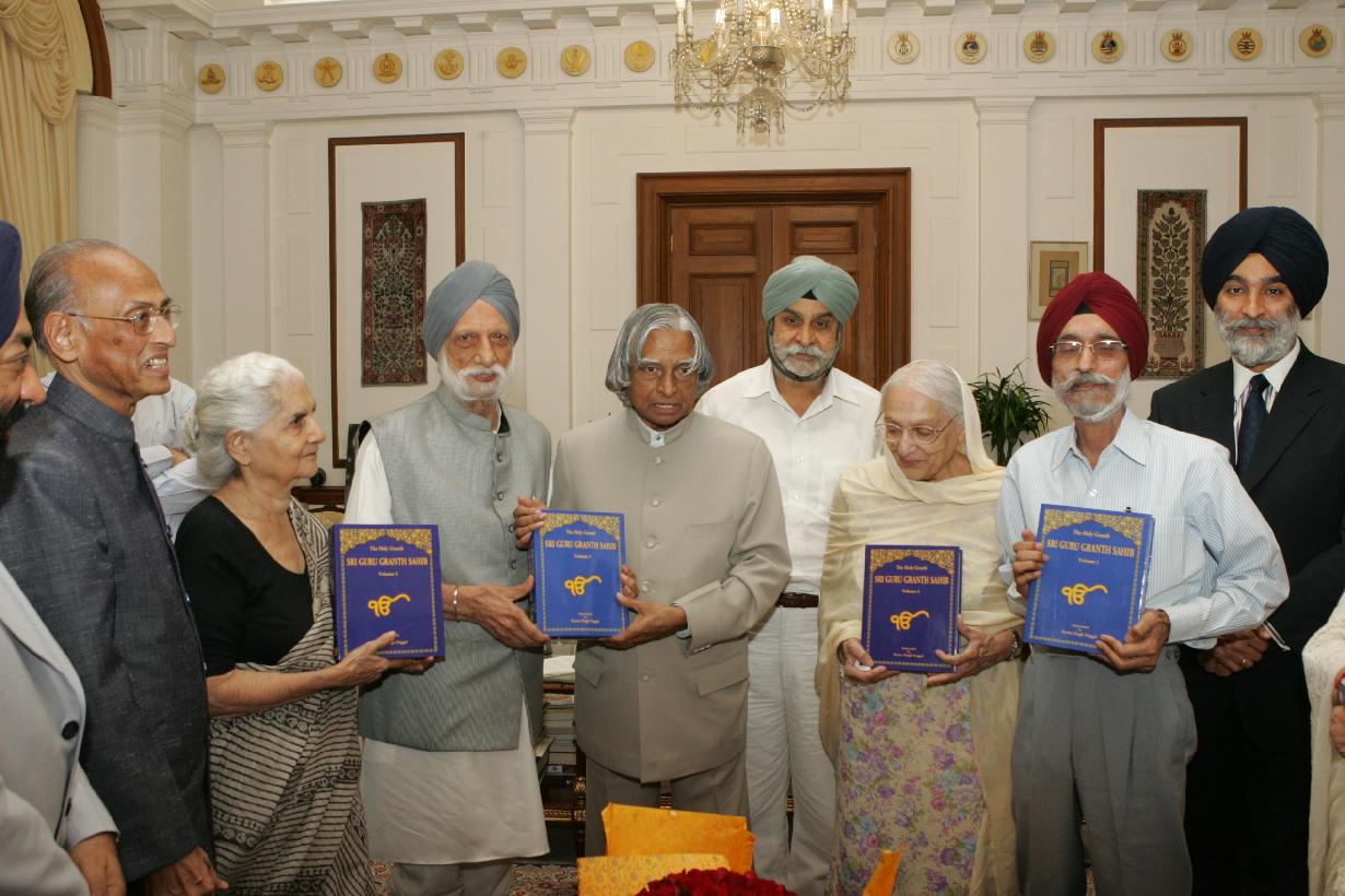 | Caption: | The President of India, Dr A P J Abdul Kalam with Dr Kartar Singh Duggal, Dr L M Singhvi and others to presenting English Verse of Sri Guru Granth Saheb at Rashtrapati Bhavan in New Delhi on Sep 06, 2006 |