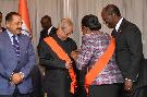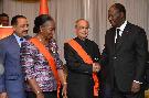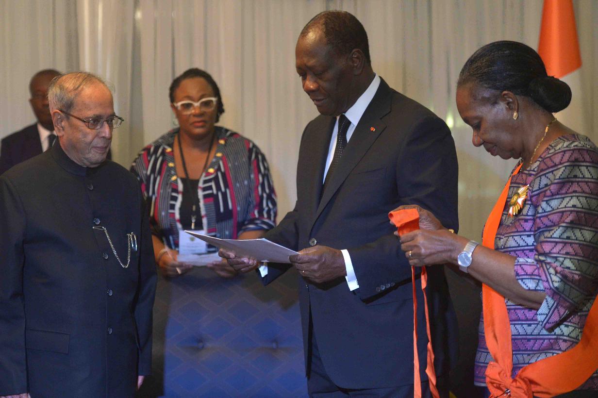 | Caption: | The President of the Republic of Cote d lvoire, H.E. Mr. Alassane Ouattara presenting the highest national honour, the Grande Croix Commandeur in National Merit Order to the President of India, Shri Pranab Mukherjee, during Banquet at Presidential Palace, in Abidjan, Republic of Cote d lvoire on June 14, 2016. |