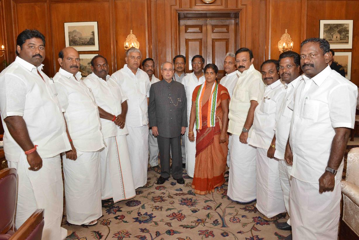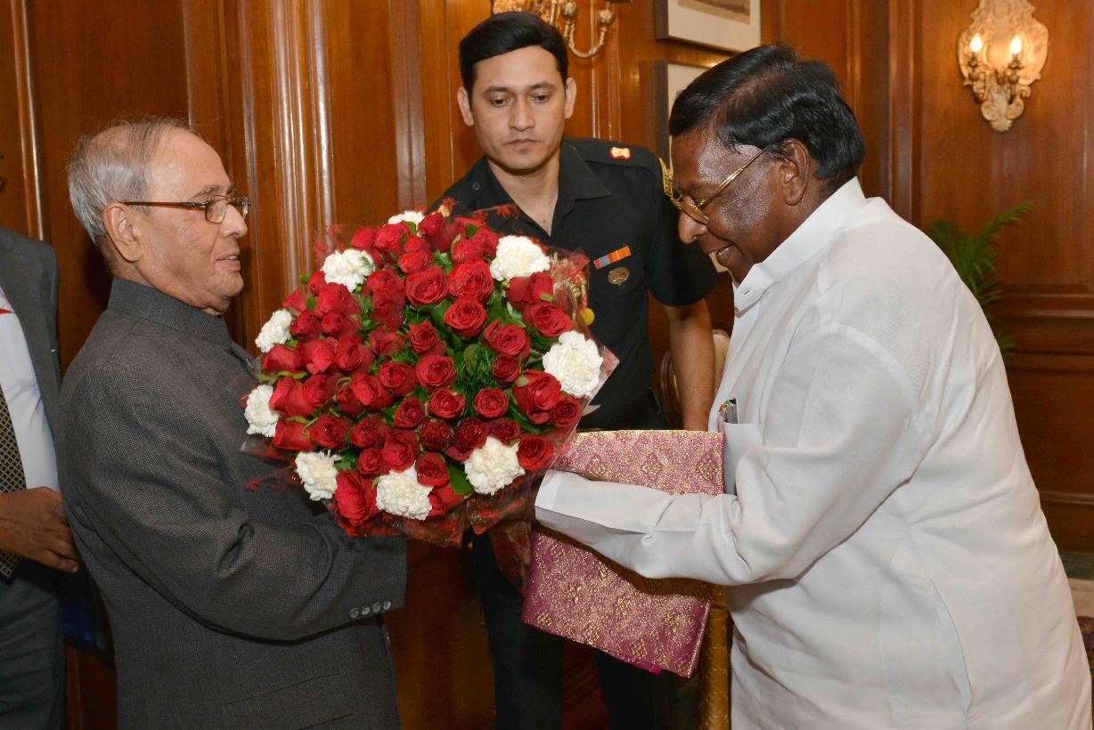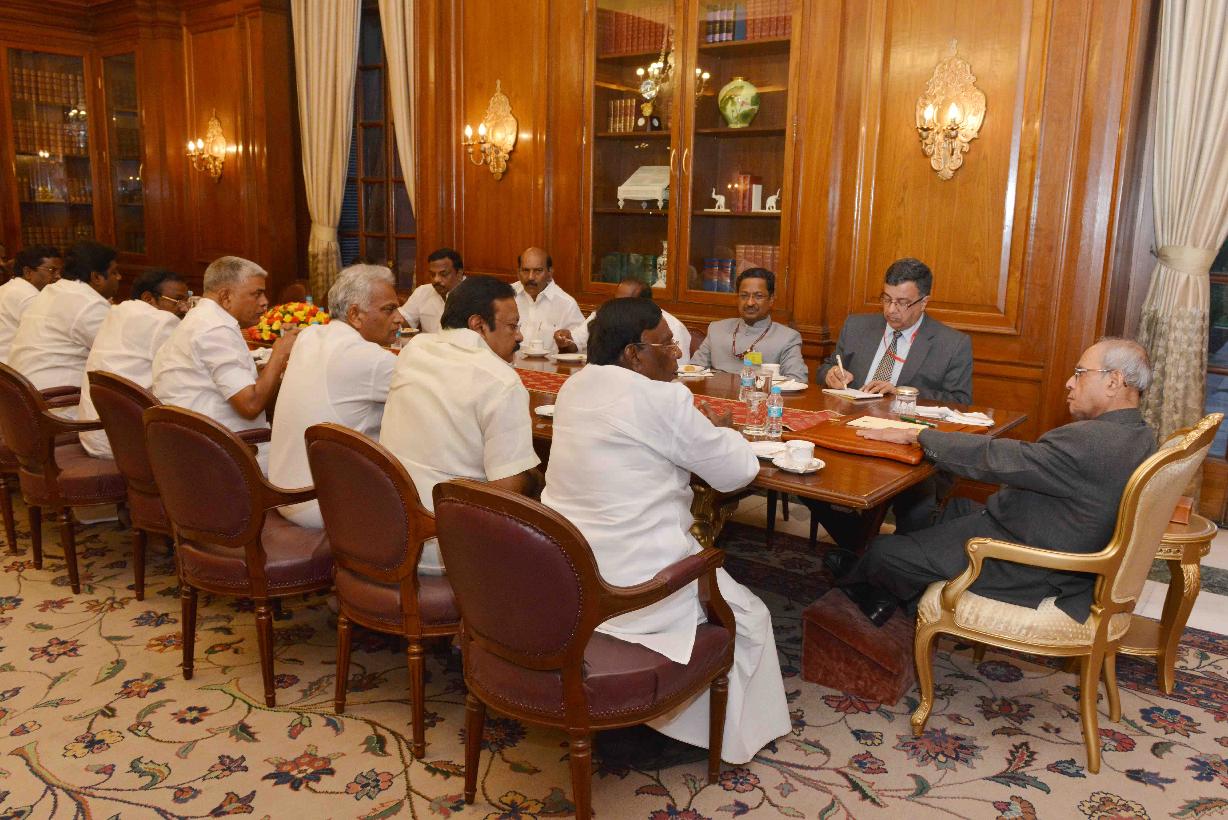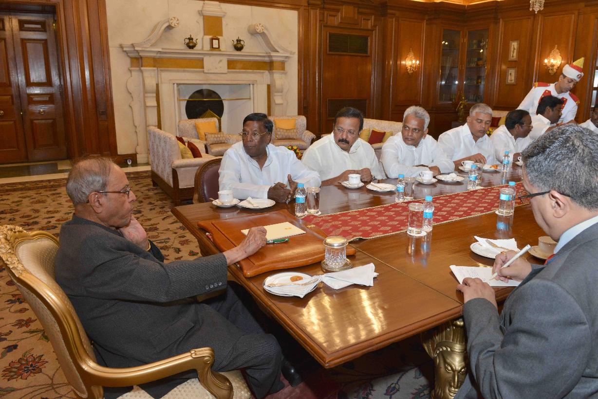 | Caption: | The President of India, Shri Pranab Mukherjee meeting with Shri V. Narayanasamy, Chief Minister of Puducherry alongwith his Council of Ministers, at Rashtrapati Bhavan on June 22, 2016. |