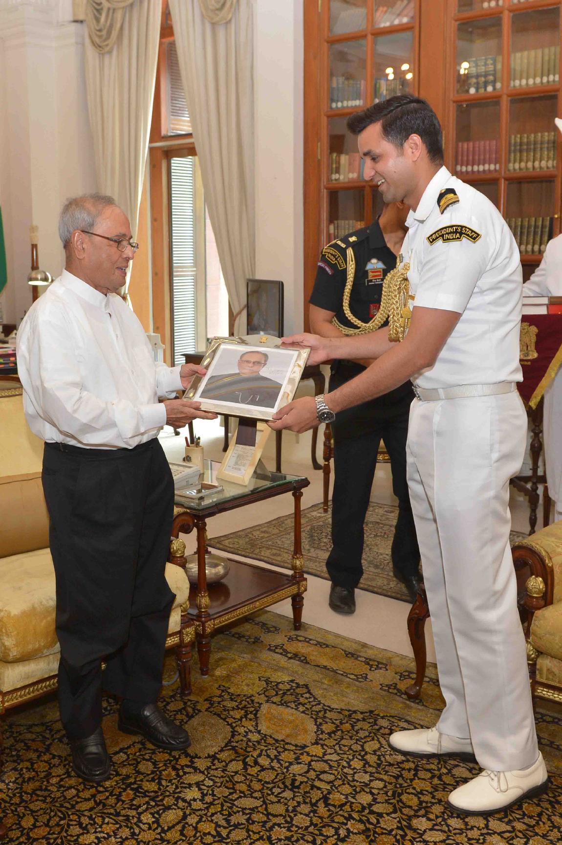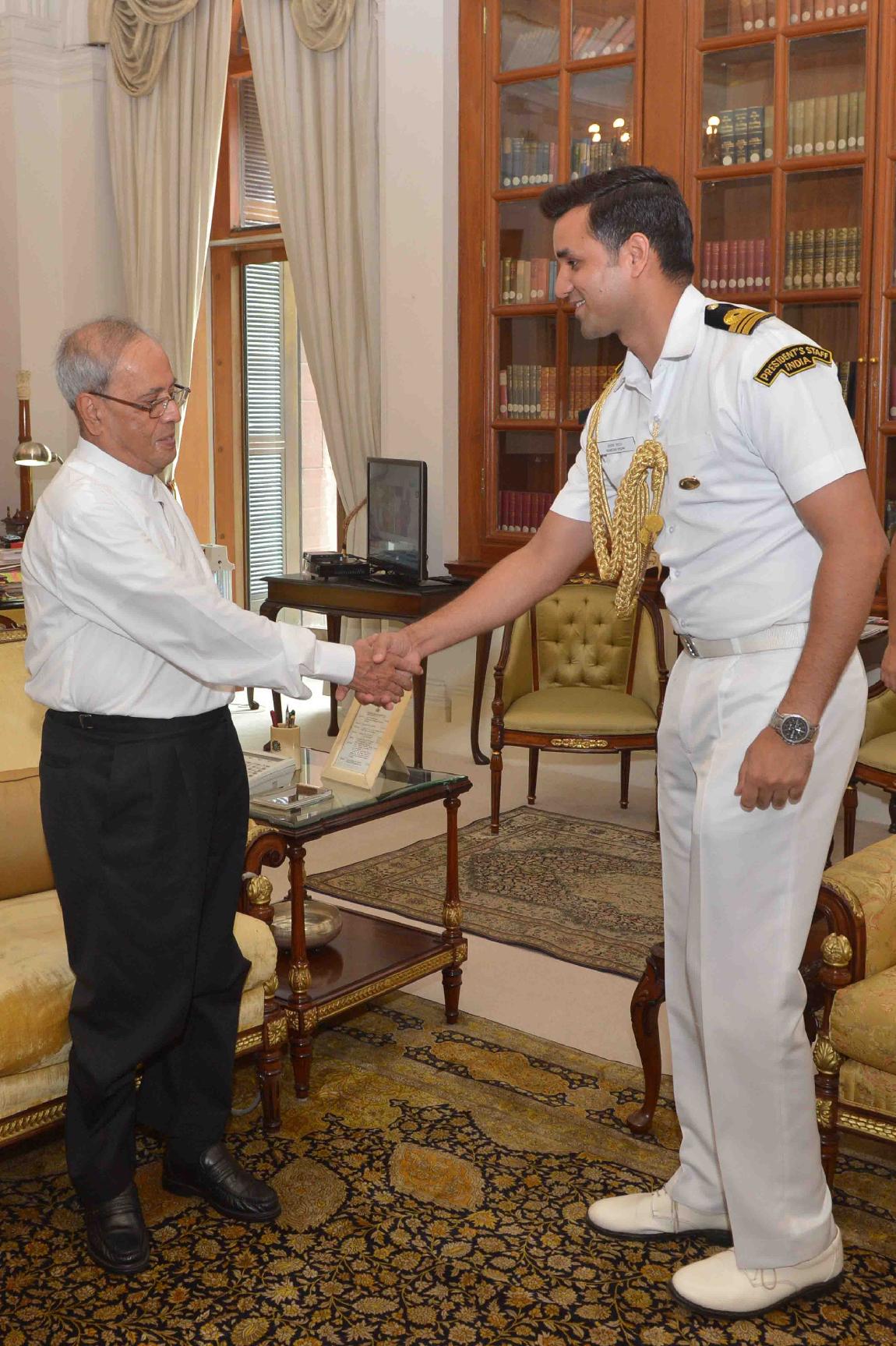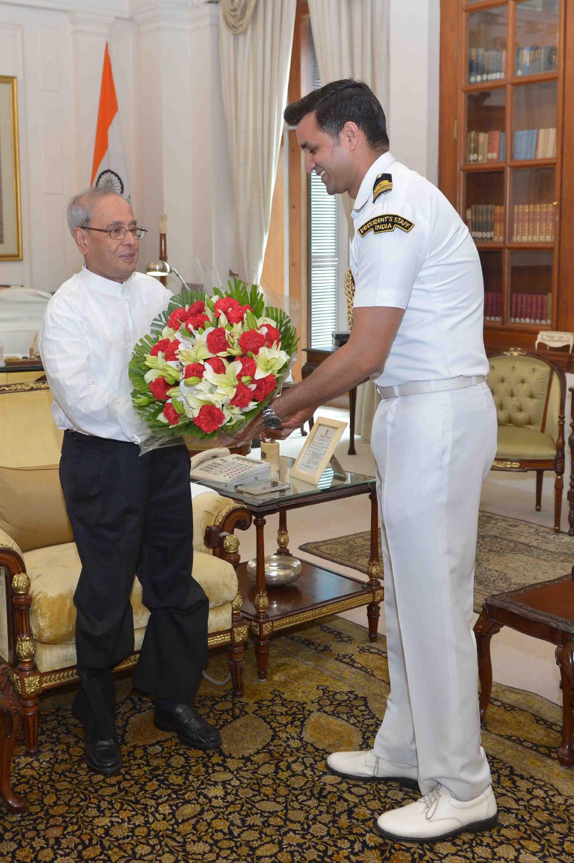 | Caption: | The President of India, Shri Pranab Mukherjee receives a farewell call from Lt. Cdr. Rakesh Yadav, ADC to the President, at Rashtrapati Bhavan on July 06, 2016. |