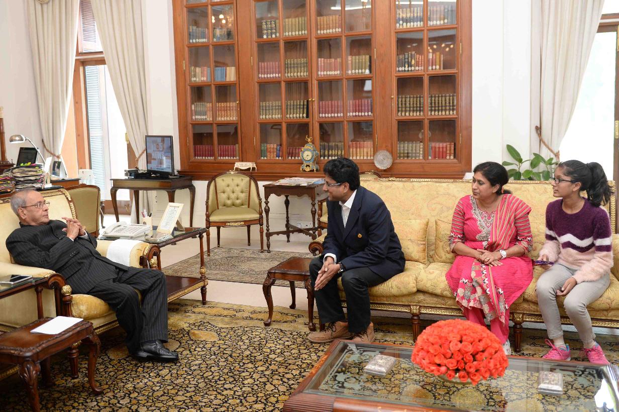 | Caption: | The President of India, Shri Pranab Mukherjee meeting with Smt. & Shri Uday Sankar Majumdar, General Manager, Syndicate Bank alongwith their daughter, at Rashtrapati Bhavan on December 19, 2016. |