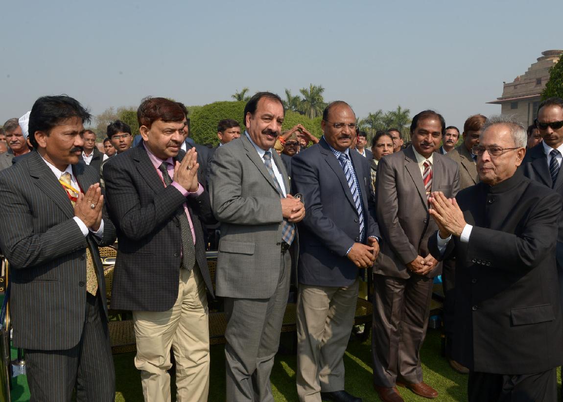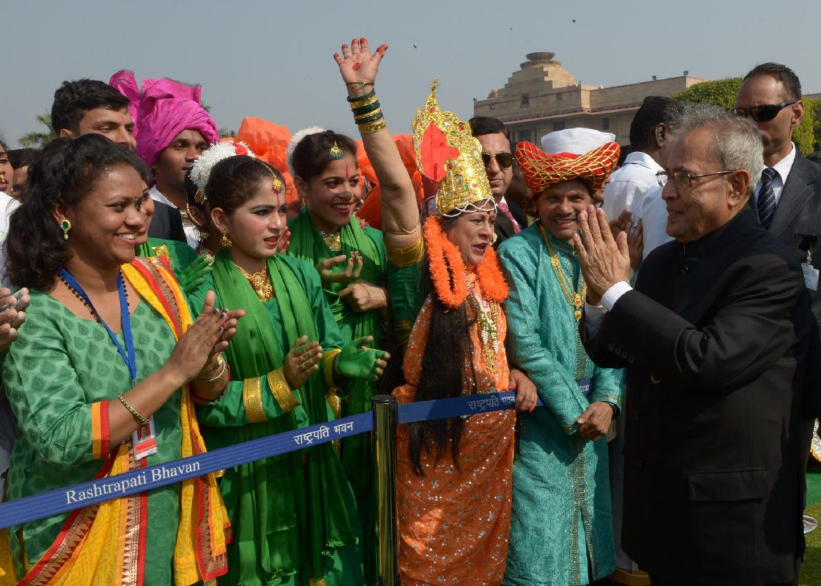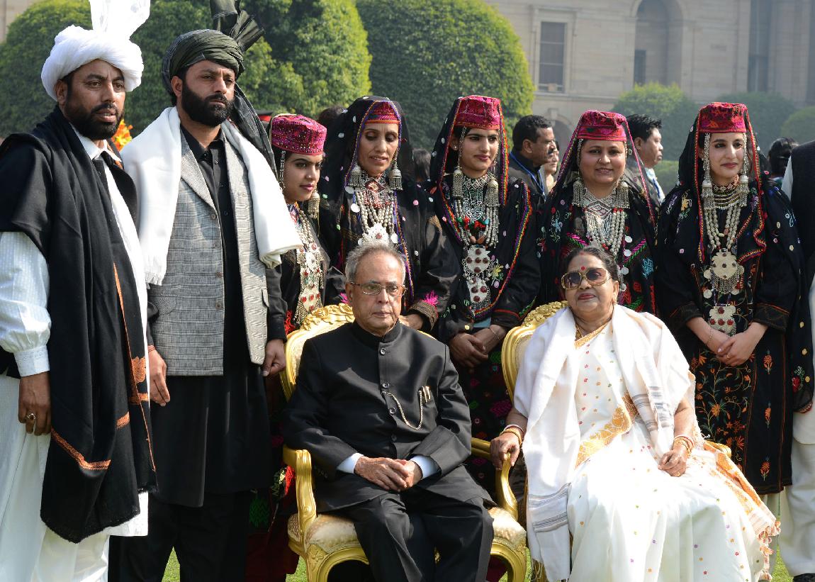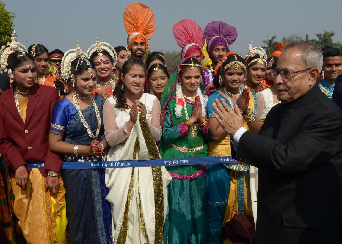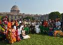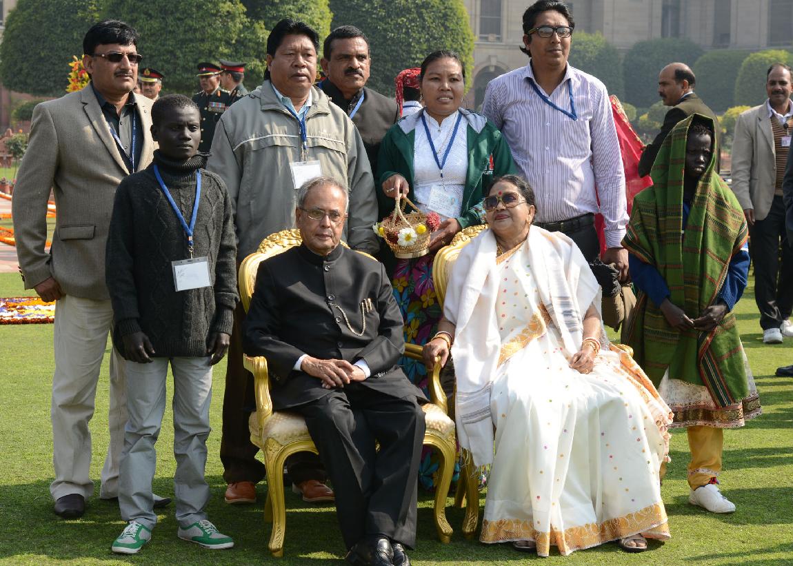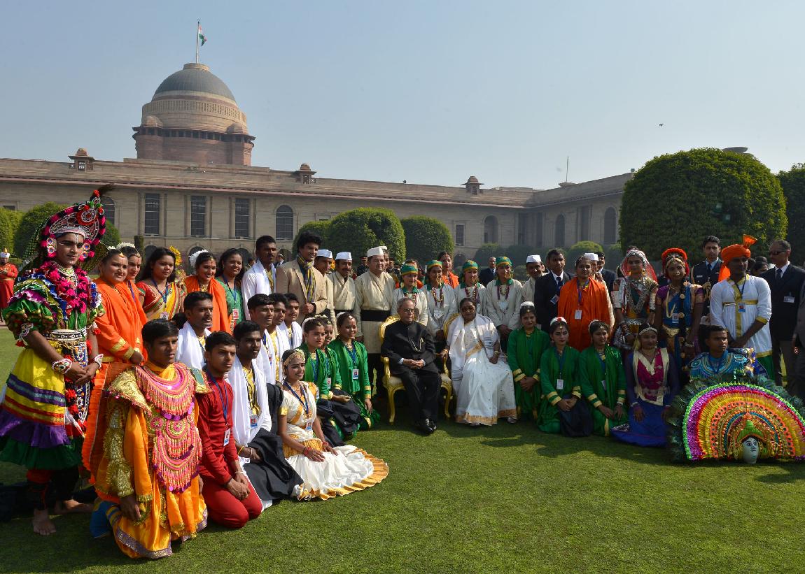 | Caption: | The President of India, Shri Pranab Mukherjee interacting with the Tribal Guests, Tableaux Artistes, Tractor Drivers, NSS Volunteers and NCC Cadets and Officials (Participants of the Republic Day Parade) at Mughal Gardens of Rashtrapati Bhavan in New Delhi on Jan 27, 2014 |