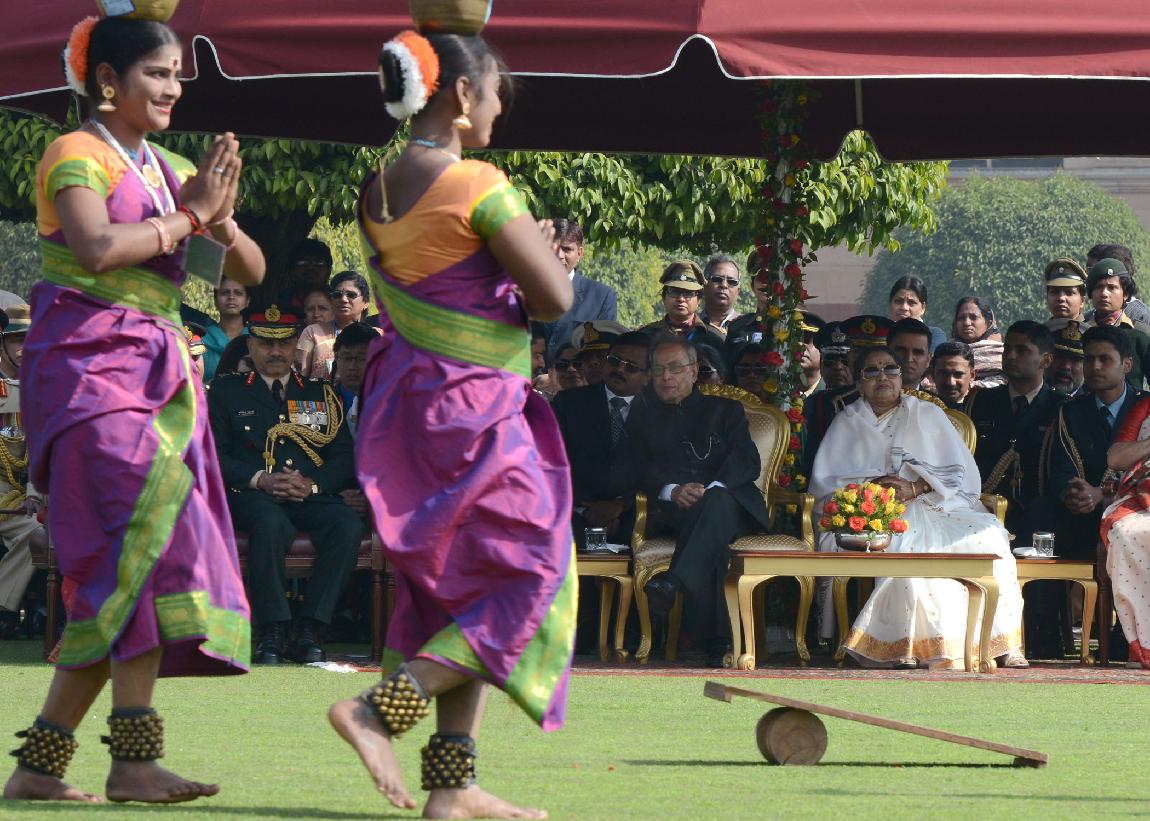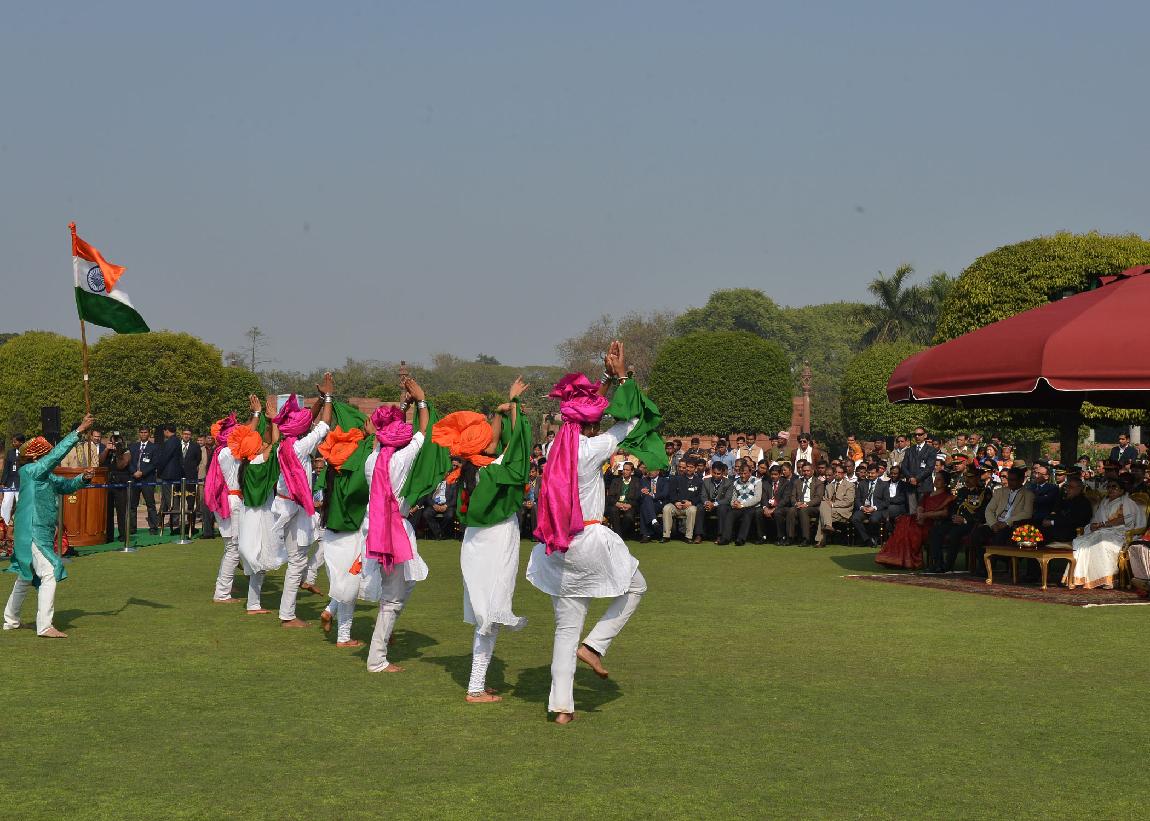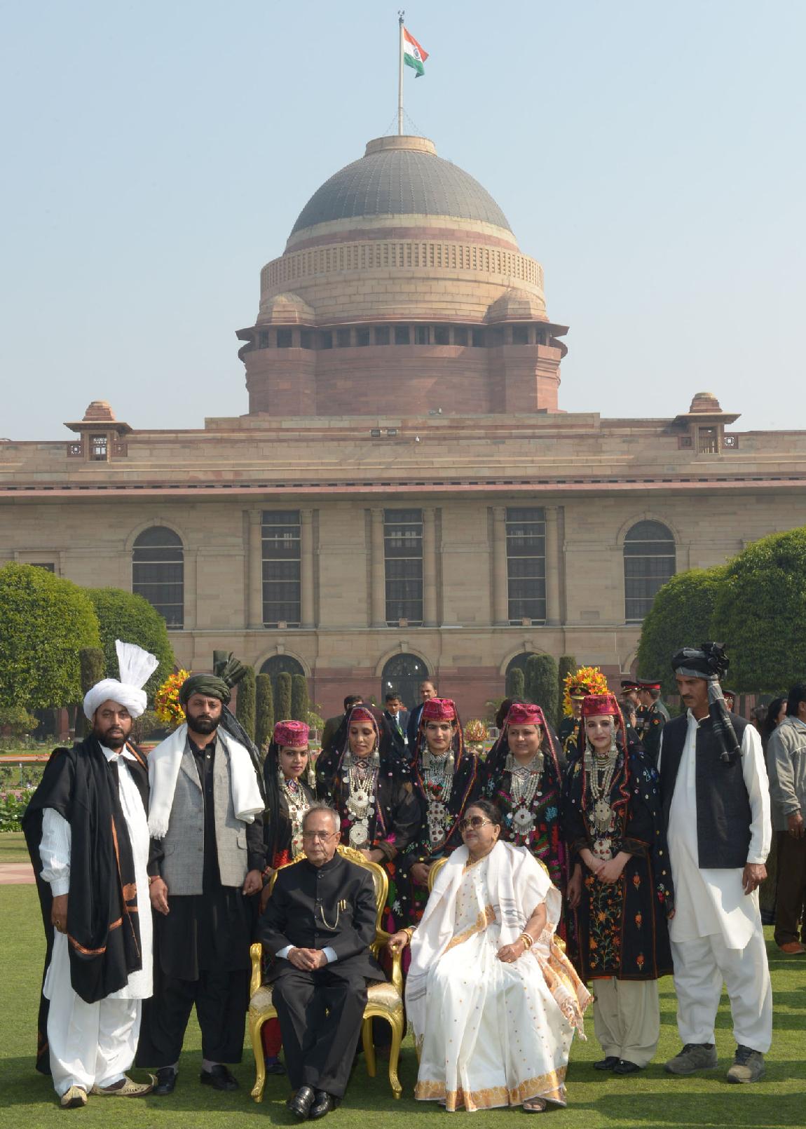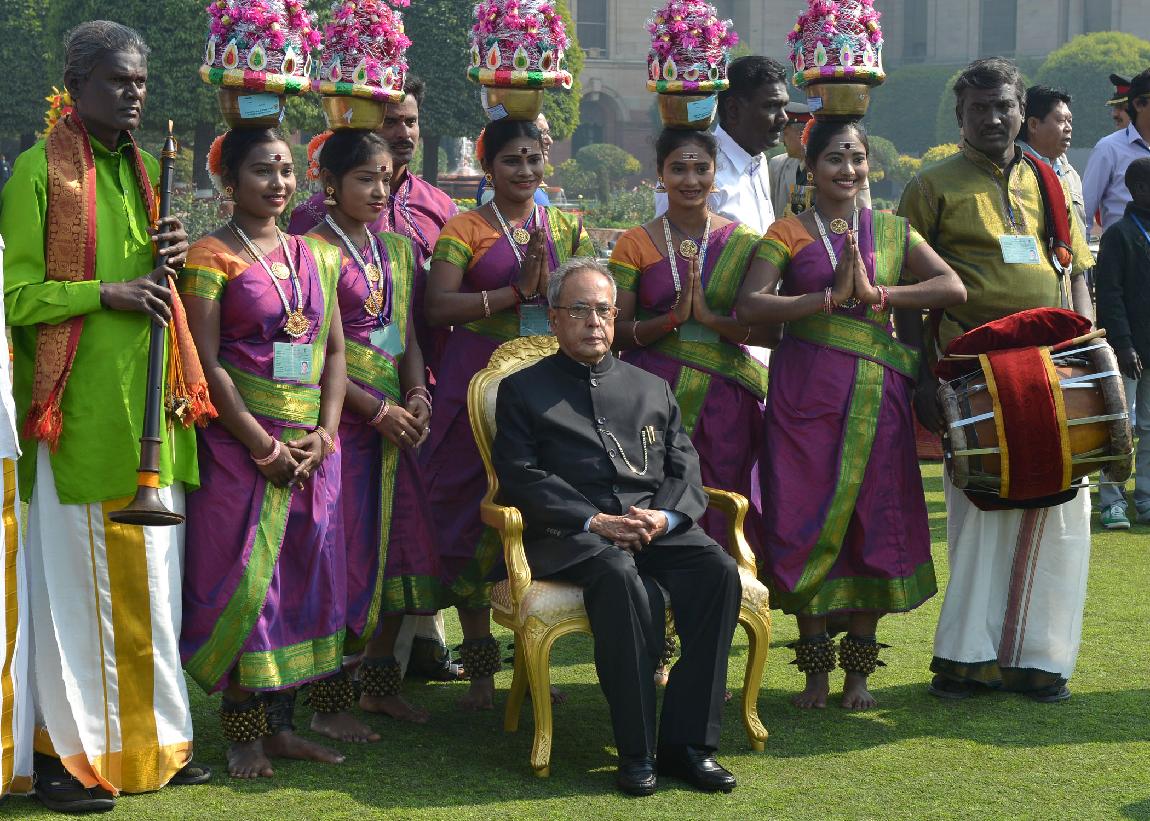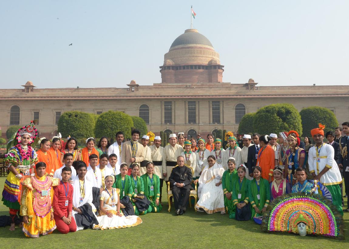 | Caption: | The President of India, Shri Pranab Mukherjee interacting with the Tribal Guests, Tableaux Artistes, Tractor Drivers, NSS Volunteers and NCC Cadets and Officials (Participants of the Republic Day Parade) at Mughal Gardens of Rashtrapati Bhavan in New Delhi on Jan 27, 2014 |