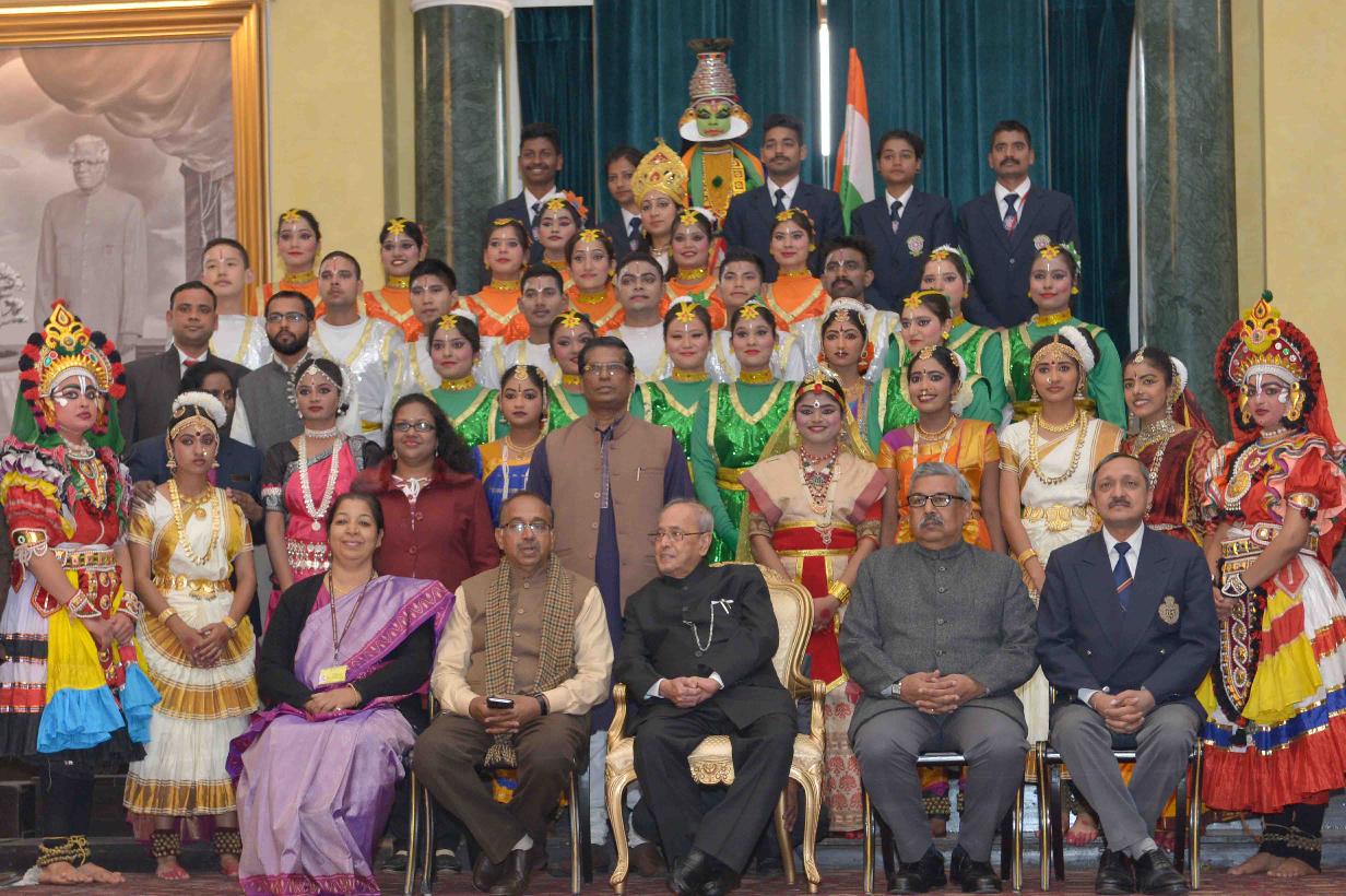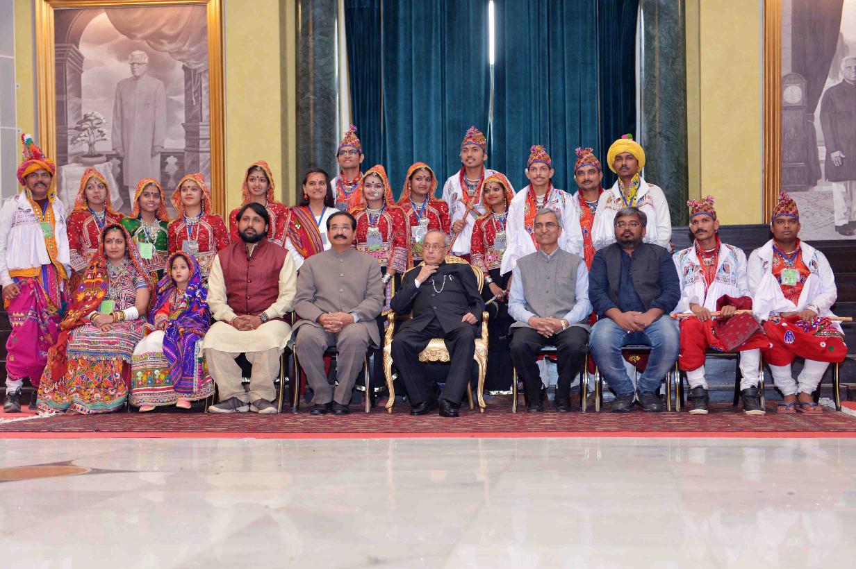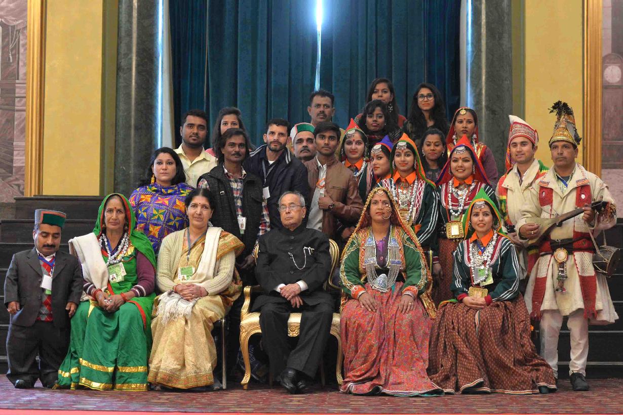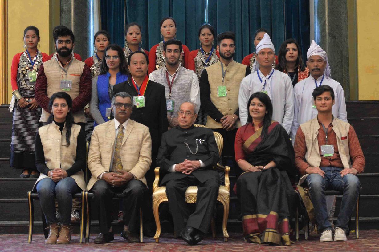 | Caption: | The President of India, Shri Pranab Mukherjee meeting with the Tribal Guests, Tableaux Artistes, Tractor Drivers, NSS Volunteers & NCC Cadets (participants of the Republic Day Parade 2017), at Rashtrapati Bhavan Cultural Centre on January 27, 2017. |