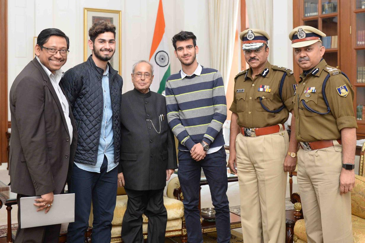 | Caption: | The President of India, Shri Pranab Mukherjee meeting with Master Mohd Asrar Rehbar and Master Basit Ahmad, football players from Jammu & Kashmir along with Shri K. Durga Prasad, Director General CRPF, Shri Sunil Thorpe, DIG, CRPF and Shri Kaushik Moulick, Founder, Football Next Foundation, Kolkata, at Rashtrapati Bhavan on February 08, 2017. |