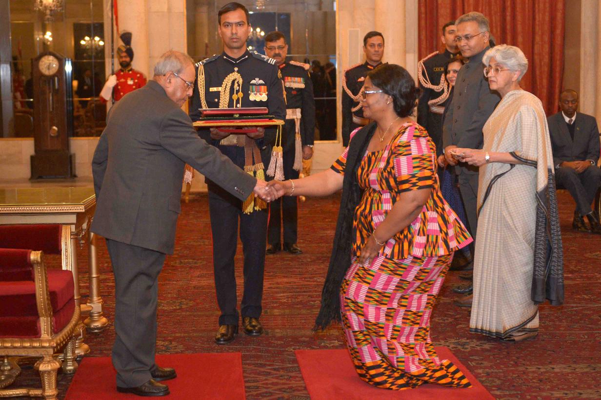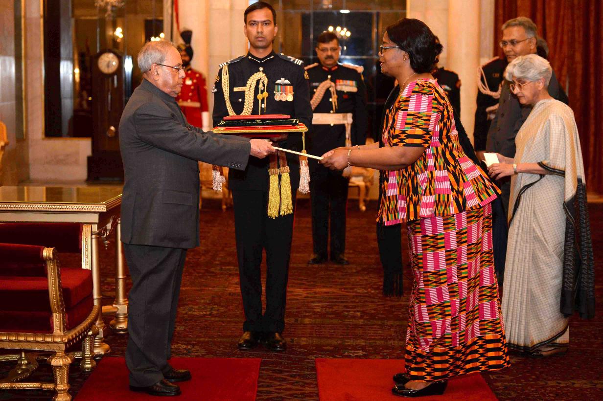 | Caption: | The Ambassador-designate of Zambia, H.E. Ms. Judith Kangoma Kapijimpanga presenting her credentials to the President of India, Shri Pranab Mukherjee, at Rashtrapati Bhavan on February 15, 2017. |