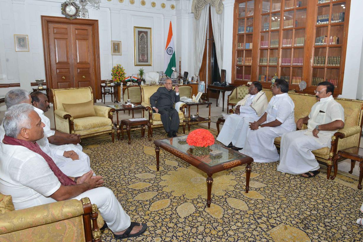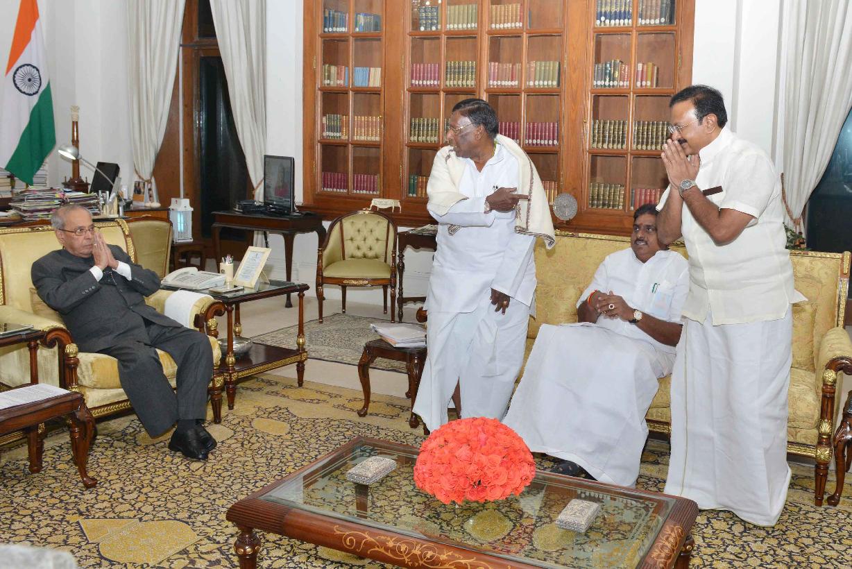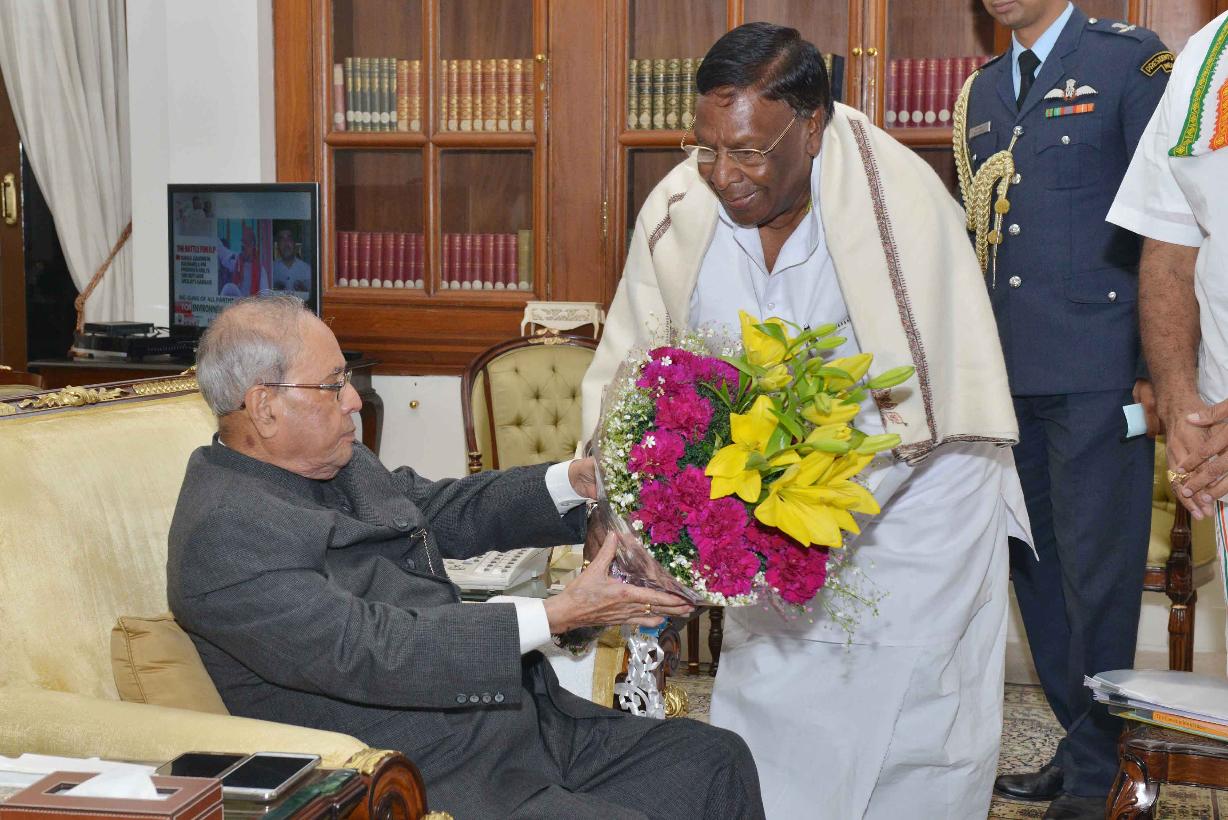 | Caption: | The President of India, Shri Pranab Mukherjee meeting with Shri V. Narayanasamy, Chief Minister of Puduchery along with his Council of Ministers, at Rashtrapati Bhavan on February 17, 2017. |