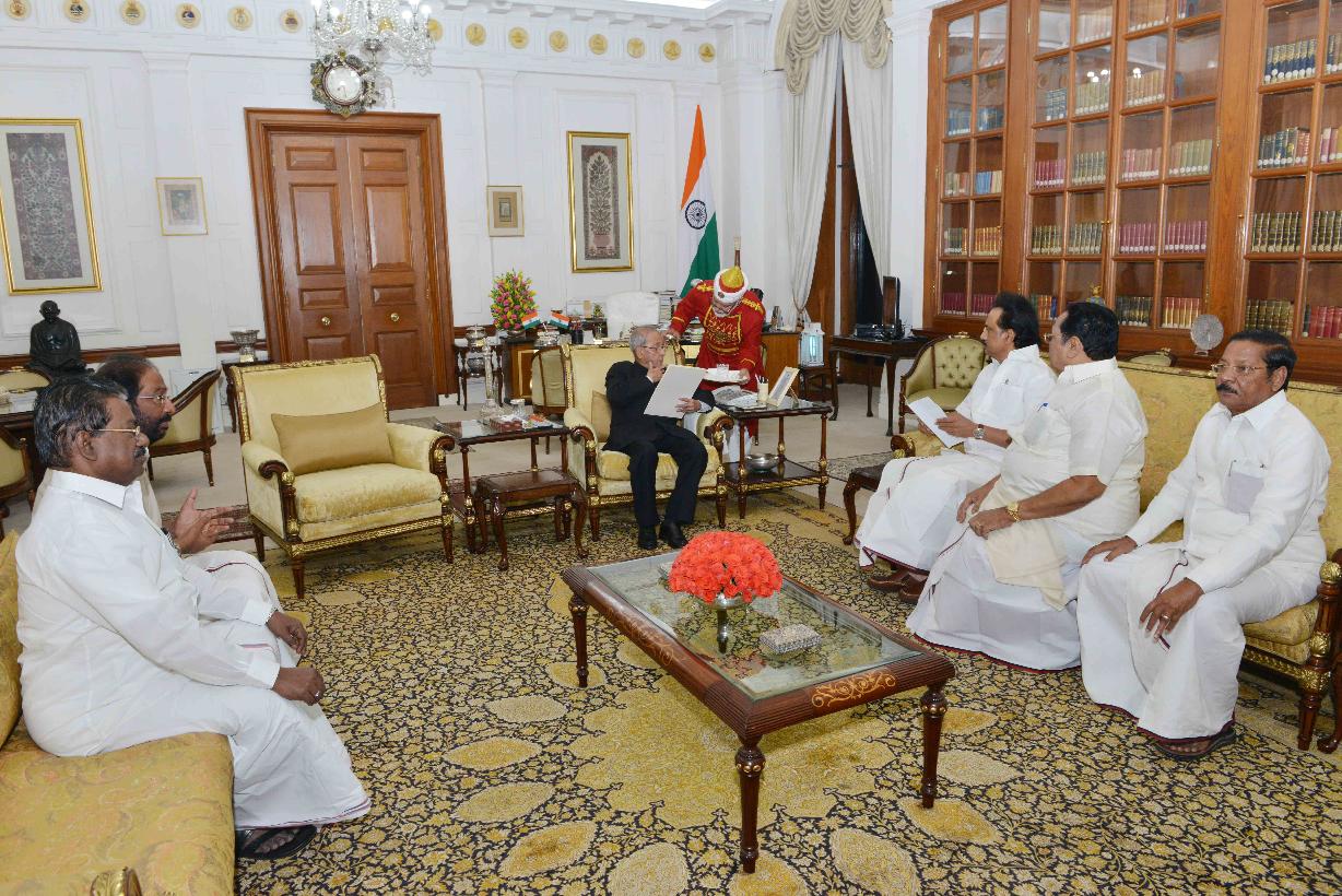 | Caption: | The President of India, Shri Pranab Mukherjee meeting with Shri M.K. Stalin, Leader of Opposition, Tamil Nadu Legislative Assembly along with Shri Durai Murugan, Dy. Leader of Opposition, Tamil Nadu Legislative Assembly, Shri Tiruchi Siva and Shri T.K.S. Elangovan, Members of Parliament, Rajya Sabha, at Rashtrapati Bhavan on February 23, 2017. |