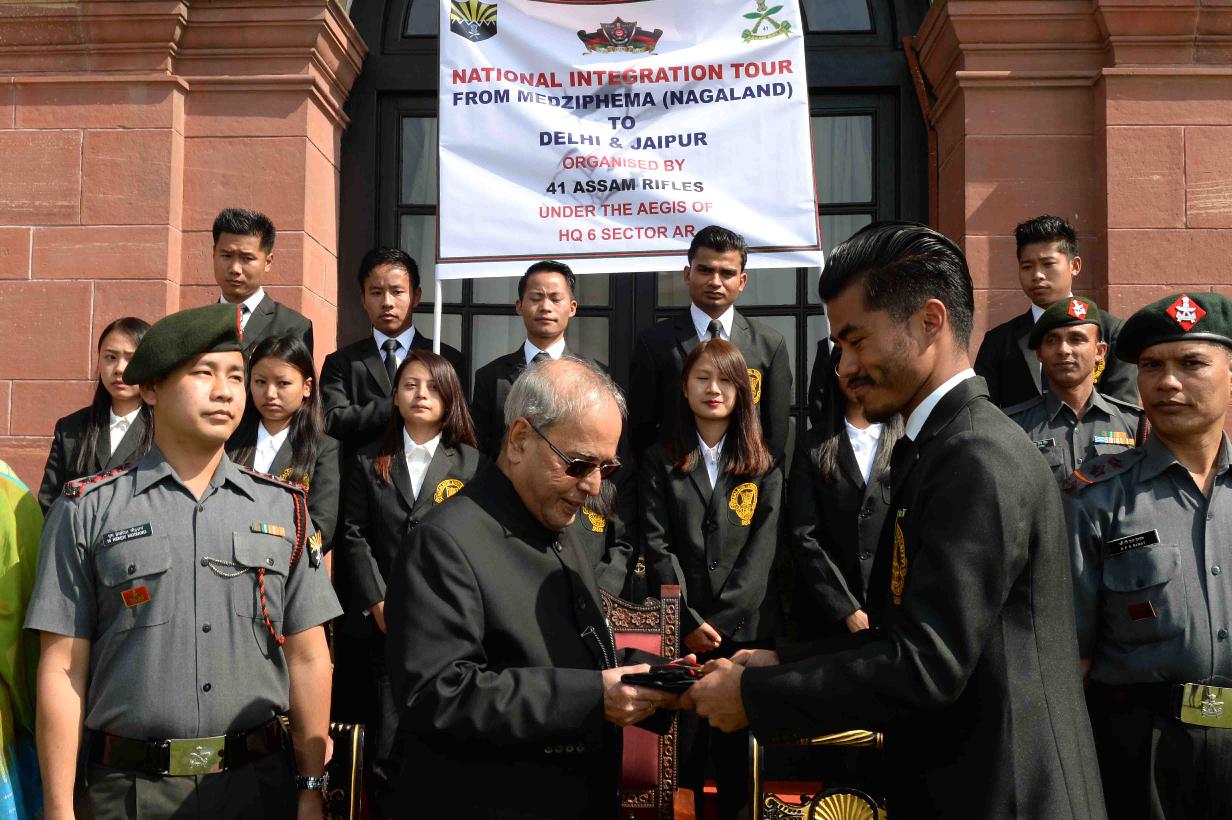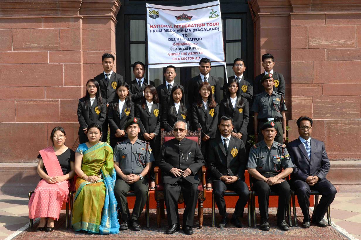 | Caption: | The President of India, Shri Pranab Mukherjee with the youths and teachers from School of Agricultural Science and Rural Development Medziphema, District Dimapur from Nagaland attending the National Integration Tour, organized by 41 Assam Rifles, at Rashtrapati Bhavan on February 18, 2017. |