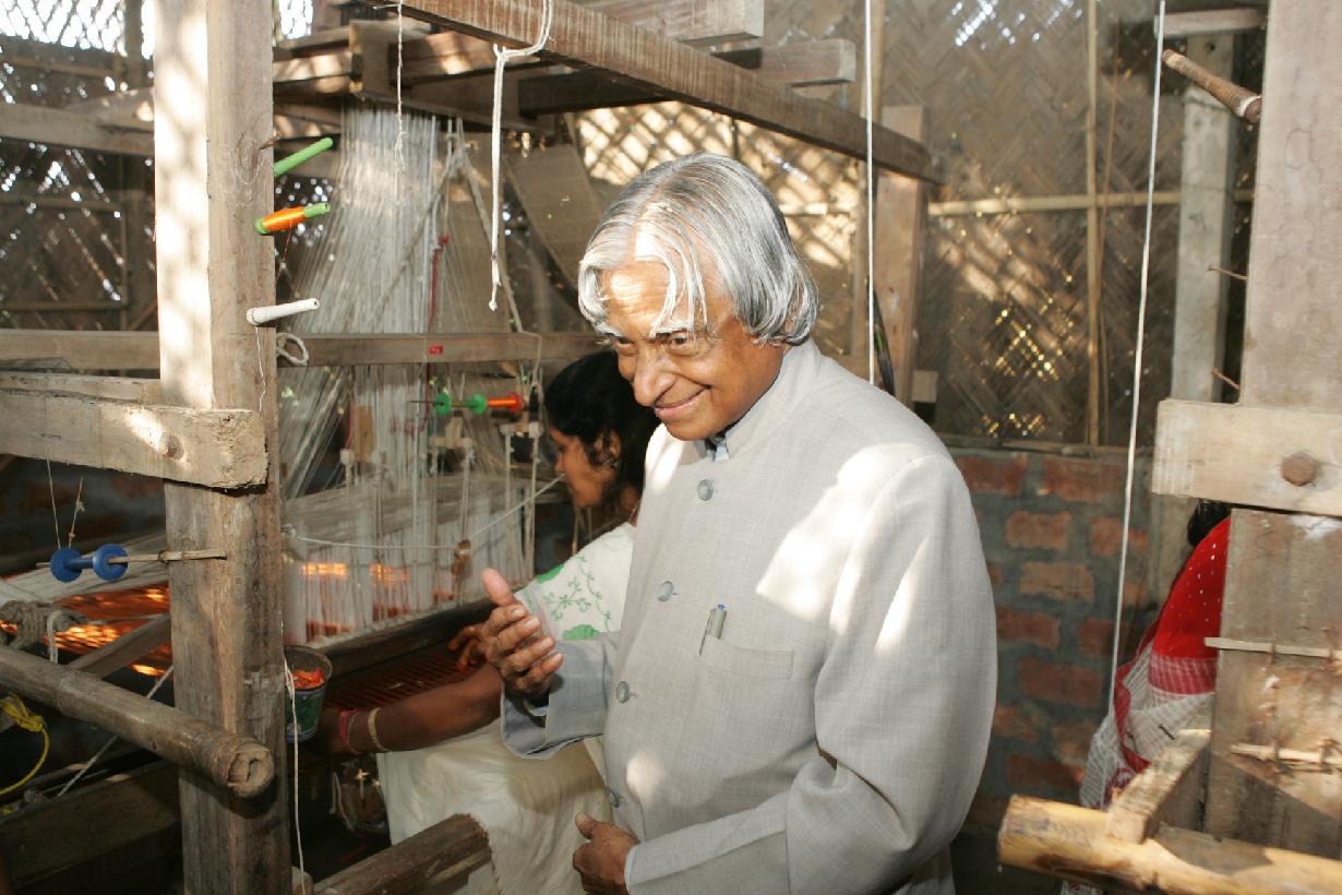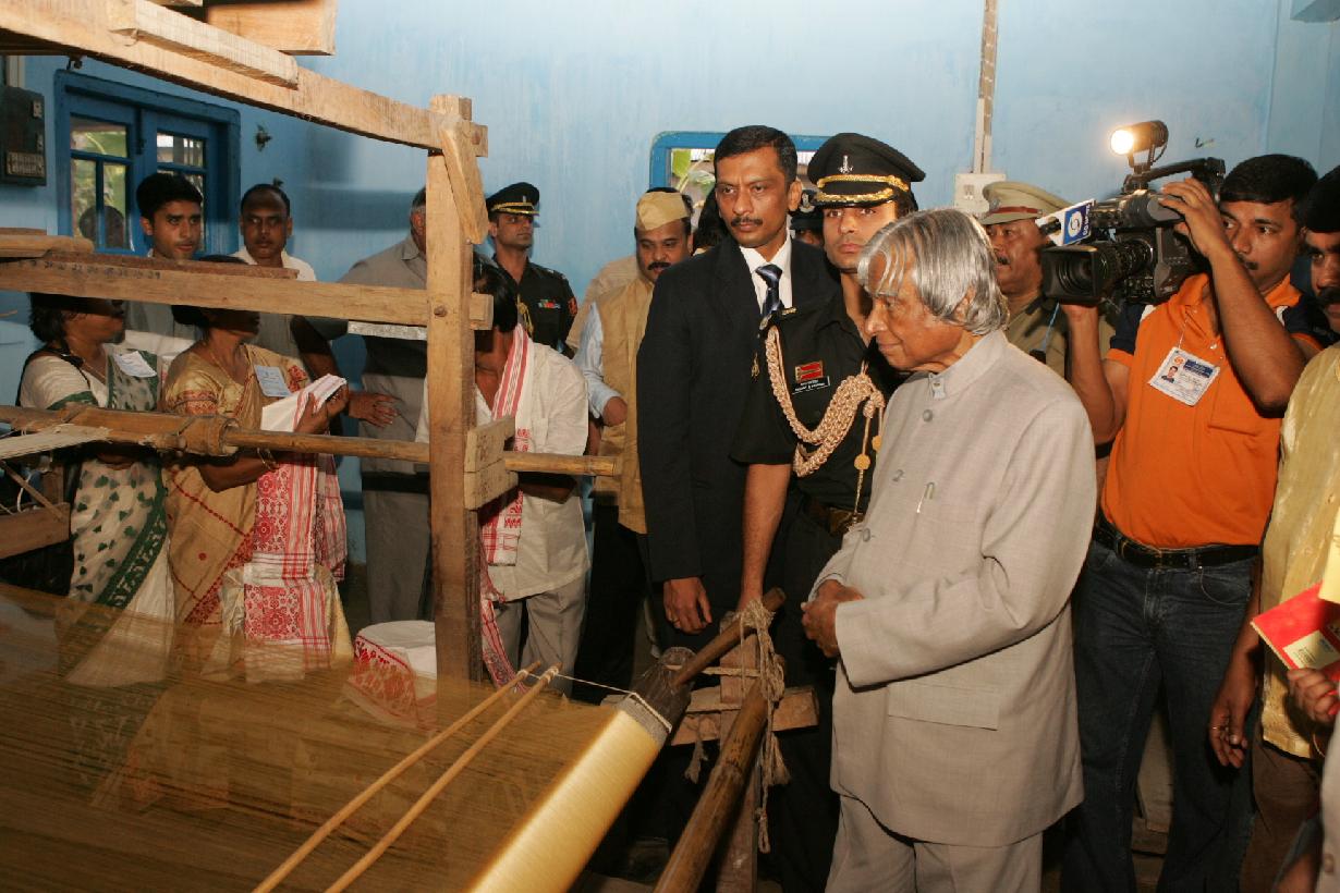 | Caption: | The President of India, Dr A P J Abdul Kalam during visit to Production Centres of Traditional Assam Silk, Handloom Weaving and Cooperative Marketing Centers at Village Sualkuchi in Assam on Oct 17, 2006 |