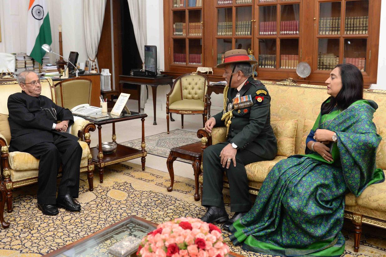 | Caption: | The President of India, Shri Pranab Mukherjee meeting with General Bipin Rawat, Chief of the Army Staff along with his wife, at Rashtrapati Bhavan on February 20, 2017. |