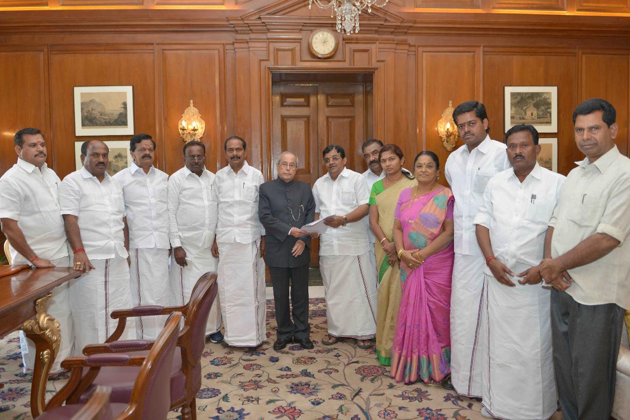 | Caption: | The President of India, Shri Pranab Mukherjee meeting with Dr. V. Maitreyan, MP (RS) along with a delegation of MPs from AIADMK, at Rashtrapati Bhavan on February 28, 2017. |