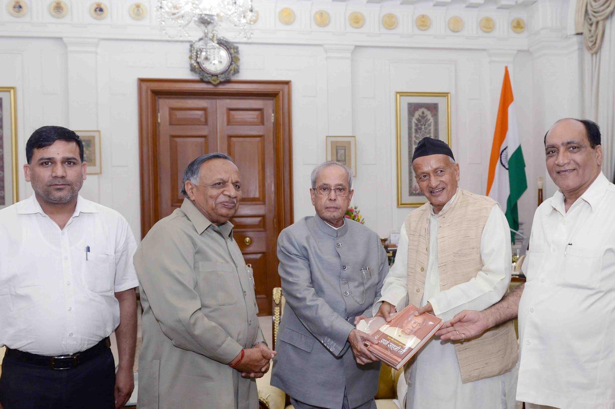 | Caption: | The President of India, Shri Pranab Mukherjee being presented a book ''Inspiring Memories'' (published by Dr. Mukherjee Smriti Nyas) by Shri Bhagat SIngh Koshyari, MP (LS) & Ex Chief Minister of Uttarakhand along with Dr. Nand Kishor Garg, Ex-MLA & Secretary, Dr. Mukherjee Smriti Nyas, Shri Puran Chandra Nainwal, Ex-Minister, Uttarakhand Govt. and Shri Jagdish Singh, at Rashtrapati Bhavan on March 23, 2017. |