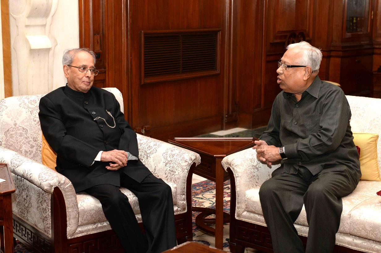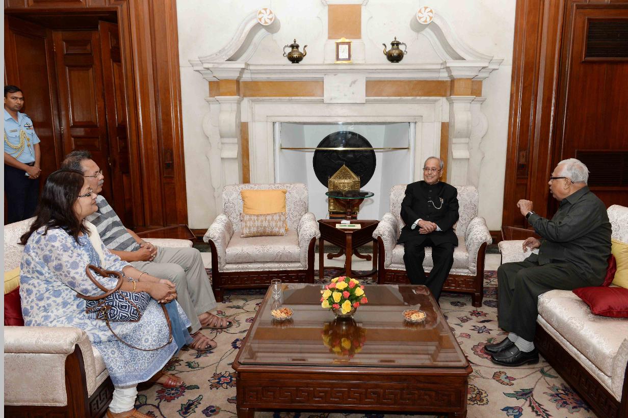 | Caption: | The President of India, Shri Pranab Mukherjee meeting with Prof. Amal Mukhopadhyay, former Principal, Presidency College, Kolkata (Artist In-Residence), at Rashtrapati Bhavan on April 04, 2017. |