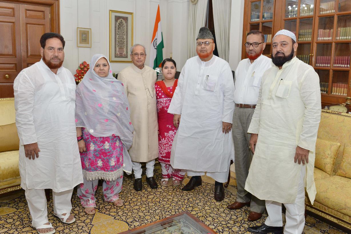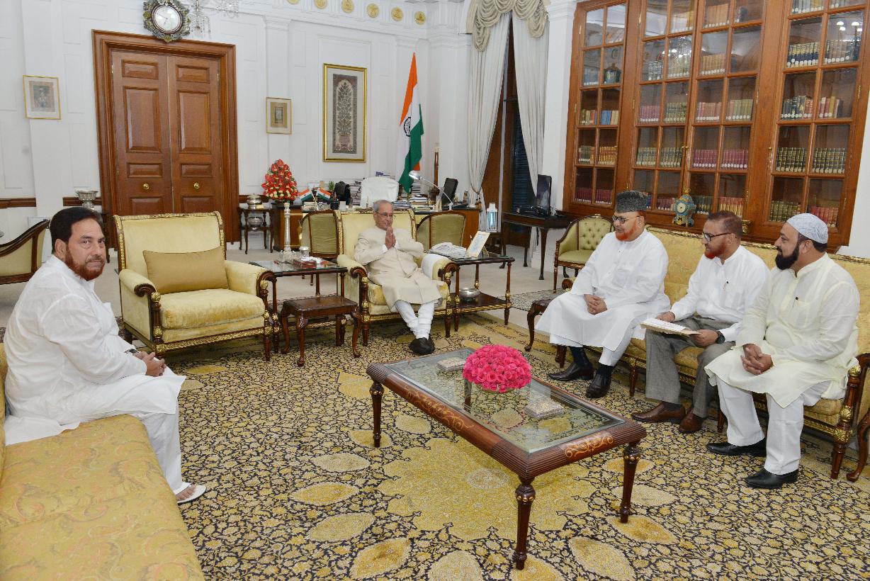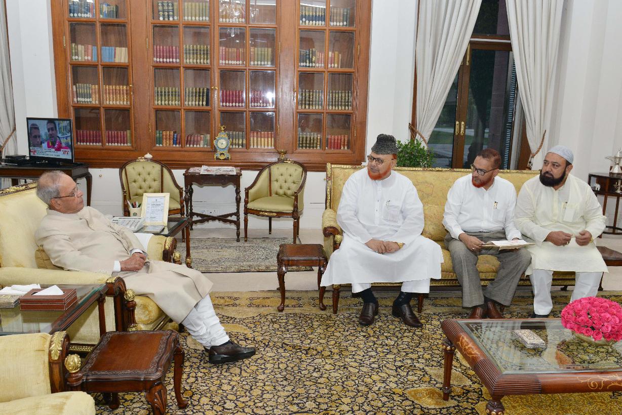 | Caption: | The President of India, Shri Pranab Mukherjee meeting with Moulana S.M. Noorur Rahman Barkati Mojdaddi, Shahi Imam & Mufti-e-Azam West Bengal, Tipu Sultan Shahi Masjid, Kolkata along with members of Majlish Shoorah, at Rashtrapati Bhavan on April 13, 2017. |