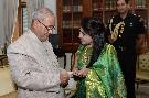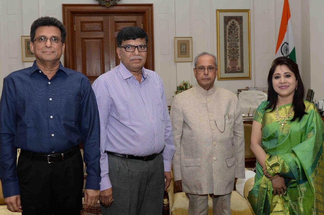 | Caption: | The President of India, Shri Pranab Mukherjee receiving a CD of patriotic song 'Disha Disha Bahe Hawa' from Ms. Devyani Majumdar, Hindustani Classical Singer with others from Mumbai, at Rashtrapati Bhavan on April 22, 2017. |