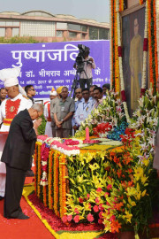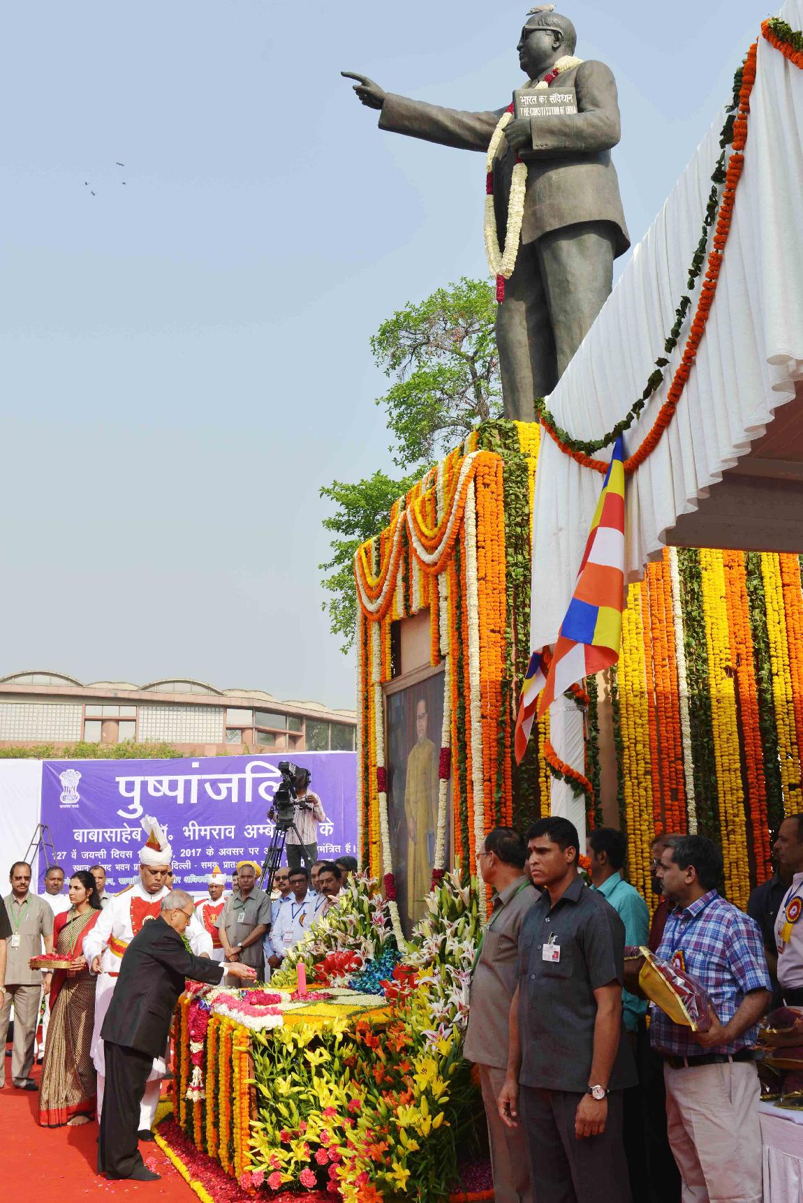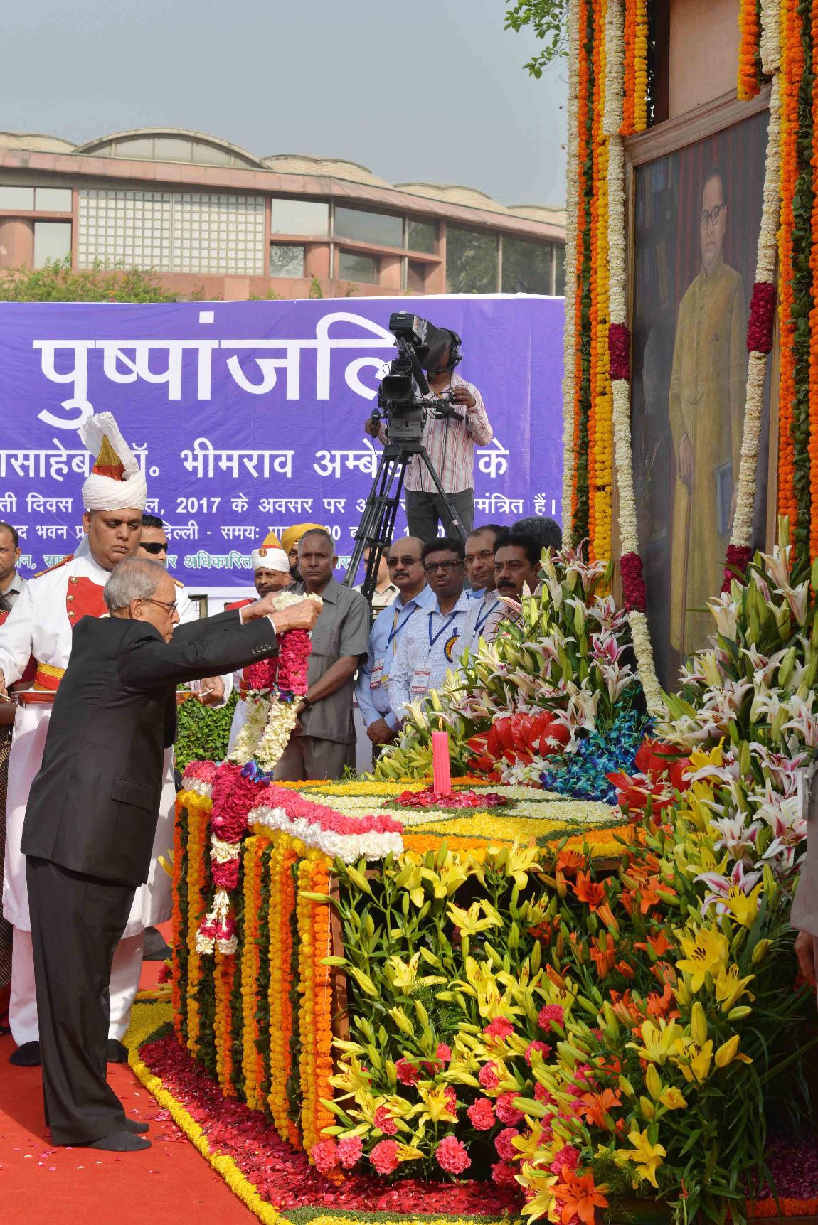 | Caption: | The President of India, Shri Pranab Mukherjee paying floral tributes at the statue of Babasaheb Dr. B.R. Ambedkar on the occasion of his birth anniversary, at Parliament House Lawns, in New Delhi on April 14, 2017. |