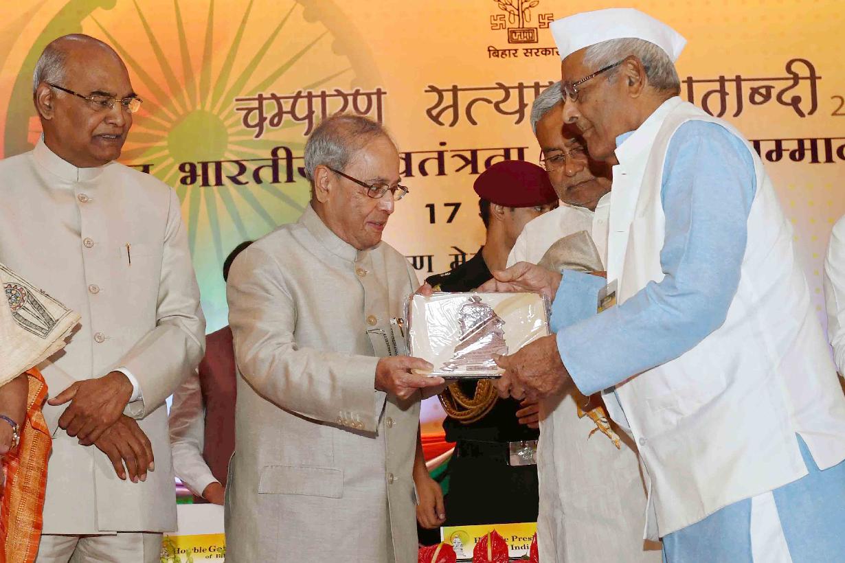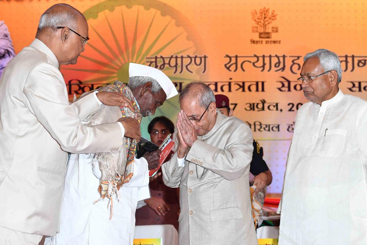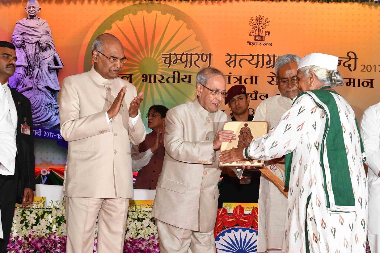 | Caption: | The President of India, Shri Pranab Mukherjee felicitating the Freedom Fighter on the occasion of Centenary of Mahatma Gandhi's Champaran Satyagraha, at Patna, in Bihar on April 17, 2017. |