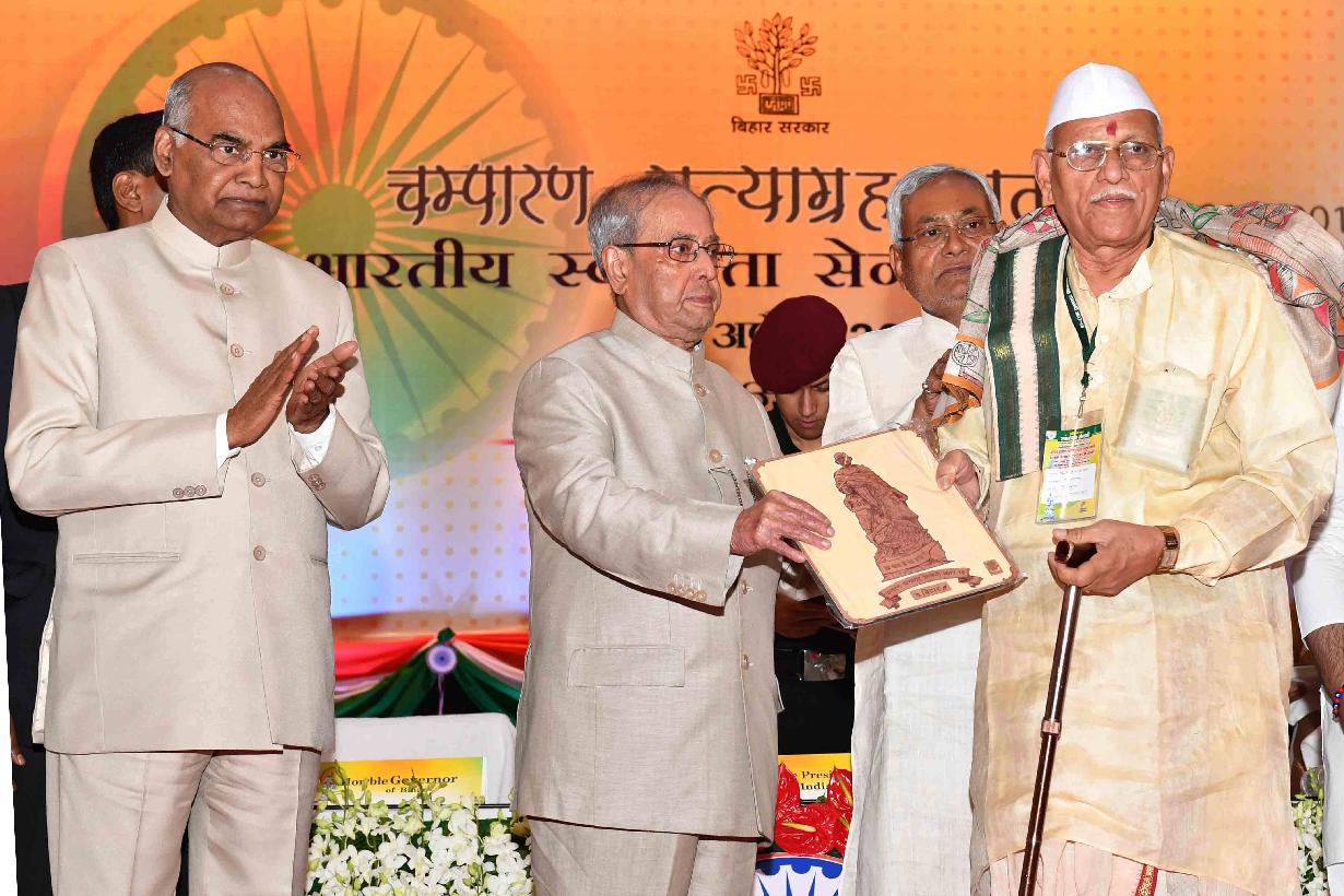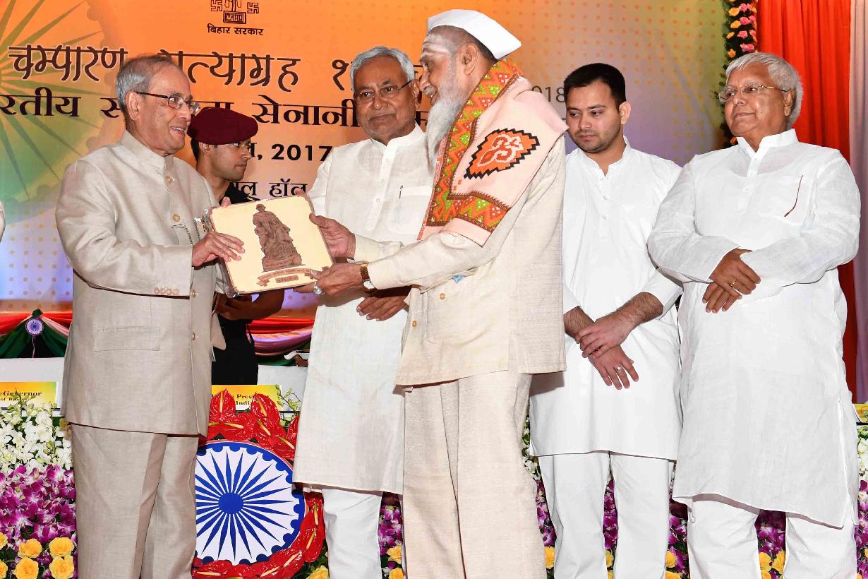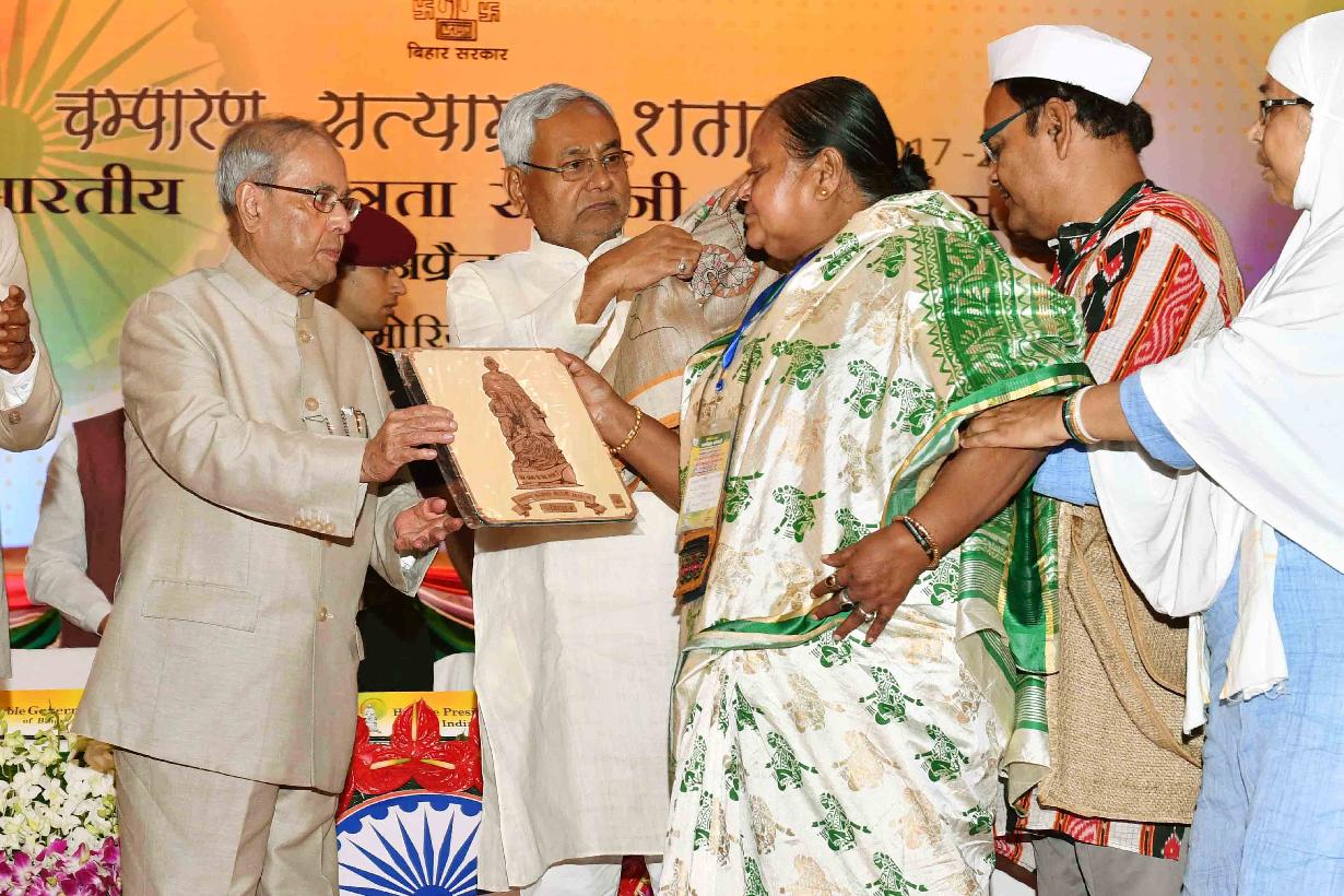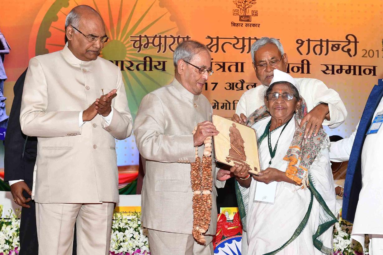 | Caption: | The President of India, Shri Pranab Mukherjee felicitating the Freedom Fighter on the occasion of Centenary of Mahatma Gandhi's Champaran Satyagraha, at Patna, in Bihar on April 17, 2017. |