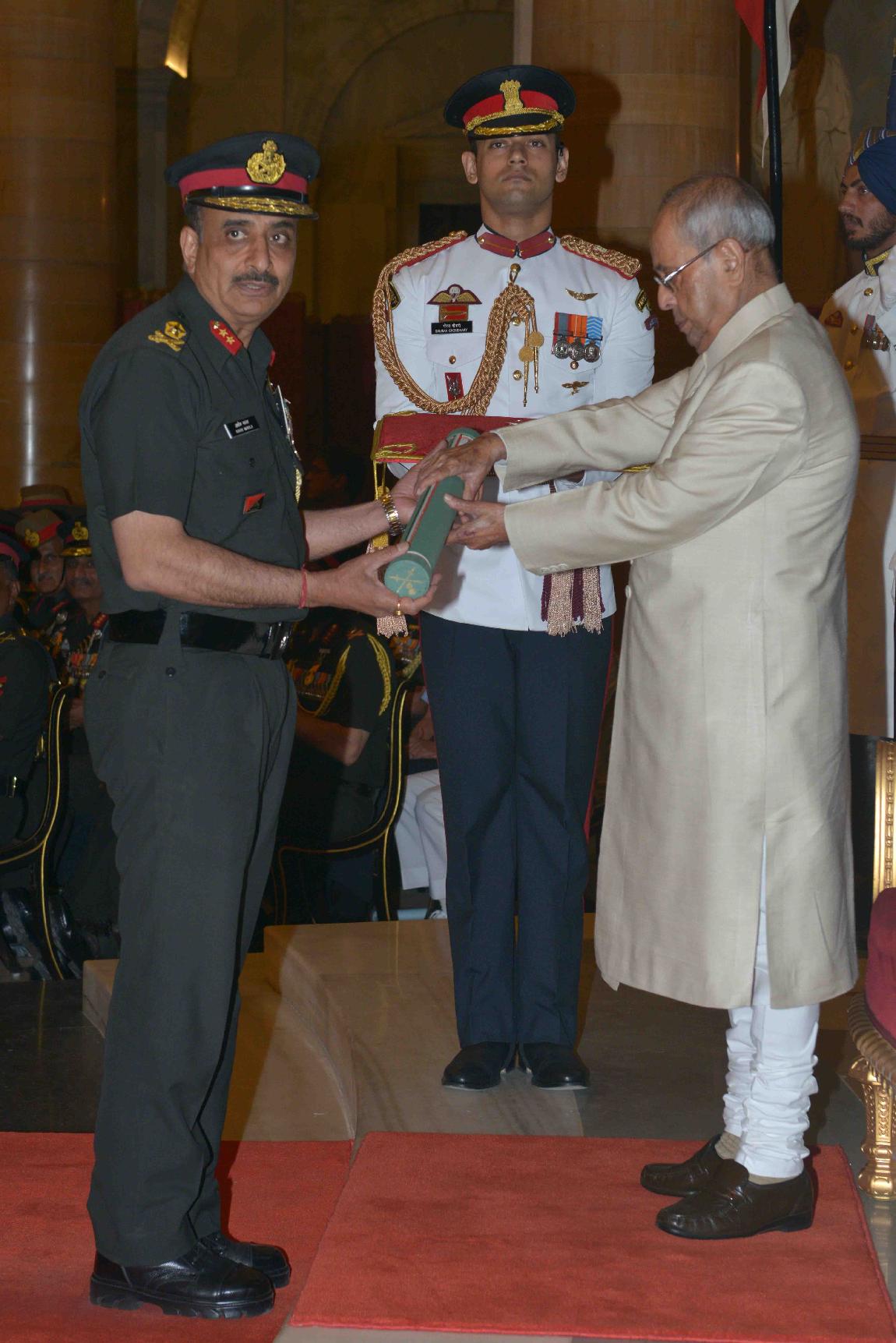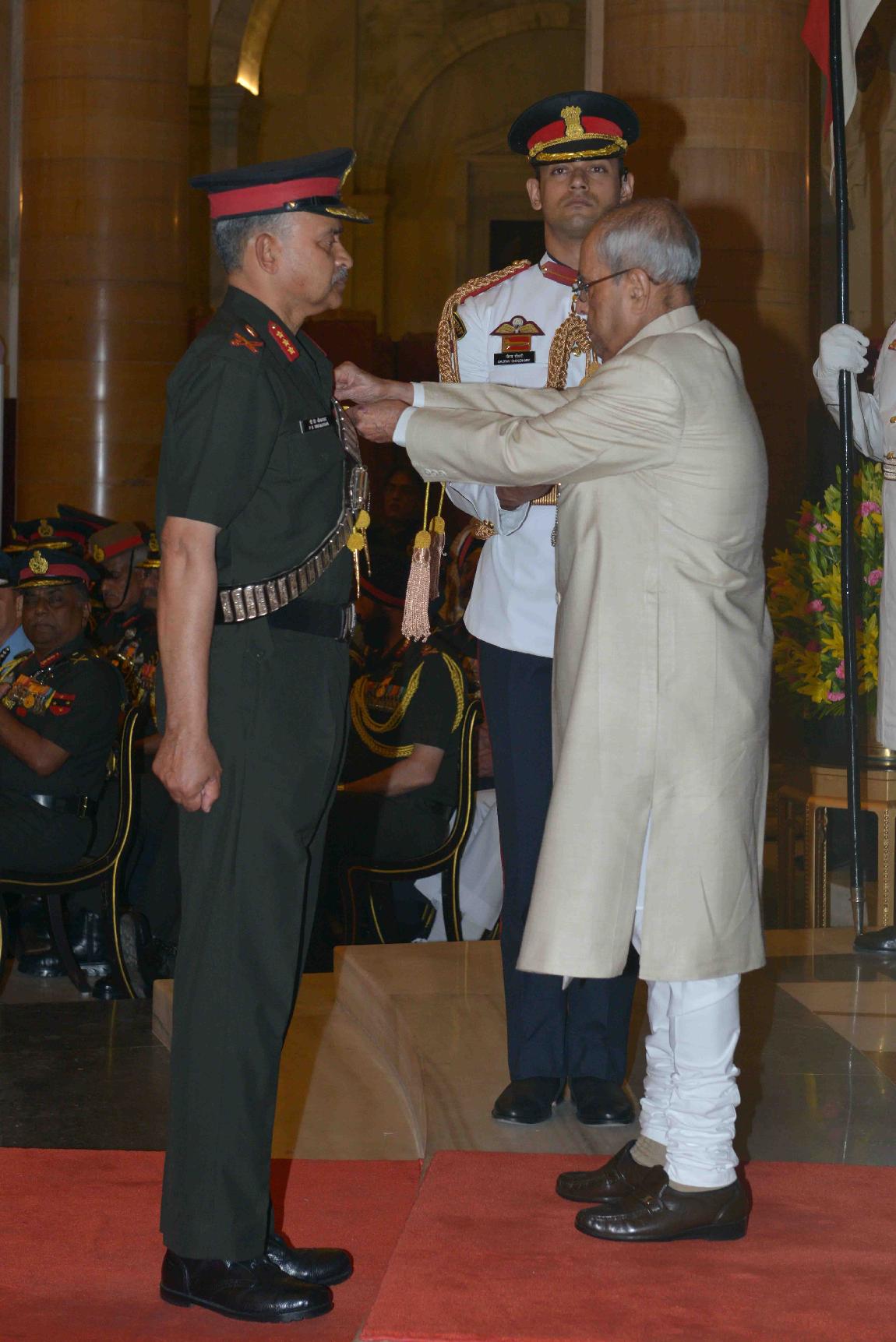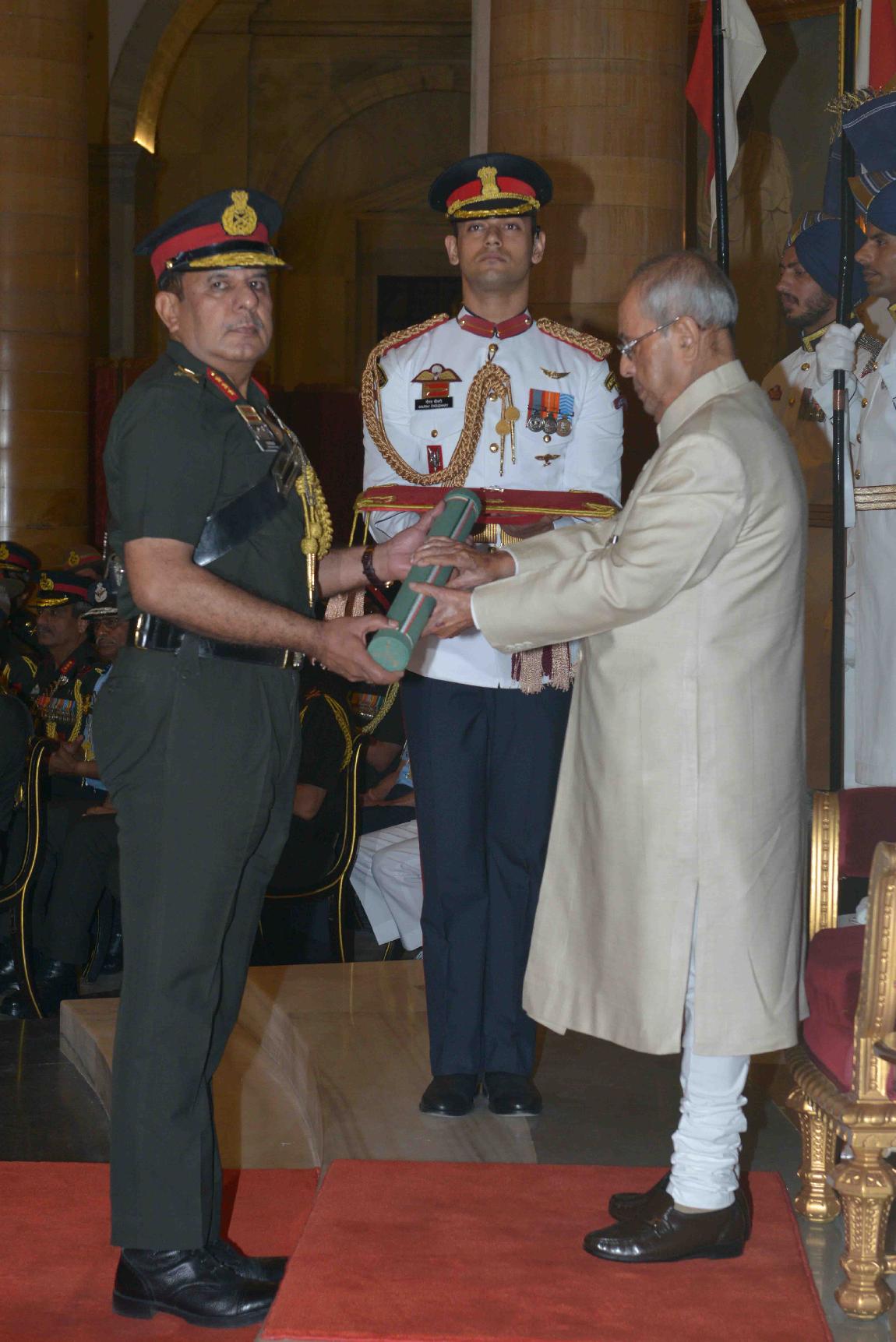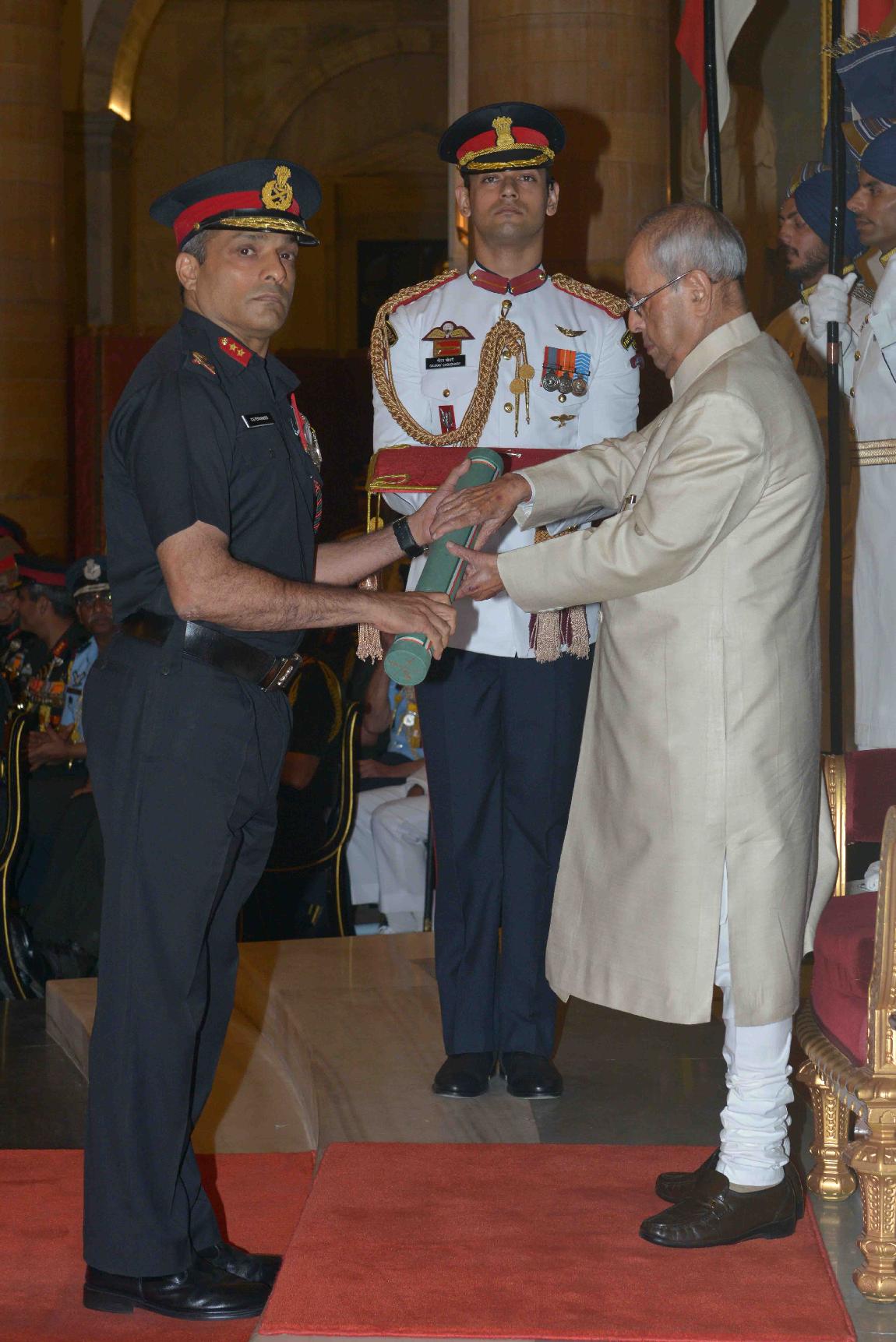 | Caption: | The President of India, Shri Pranab Mukherjee presenting the Gallantry Awards and Distinguished Service Decorations, at a Defence Investiture Ceremony, at Rashtrapati Bhavan on April 06, 2017. |