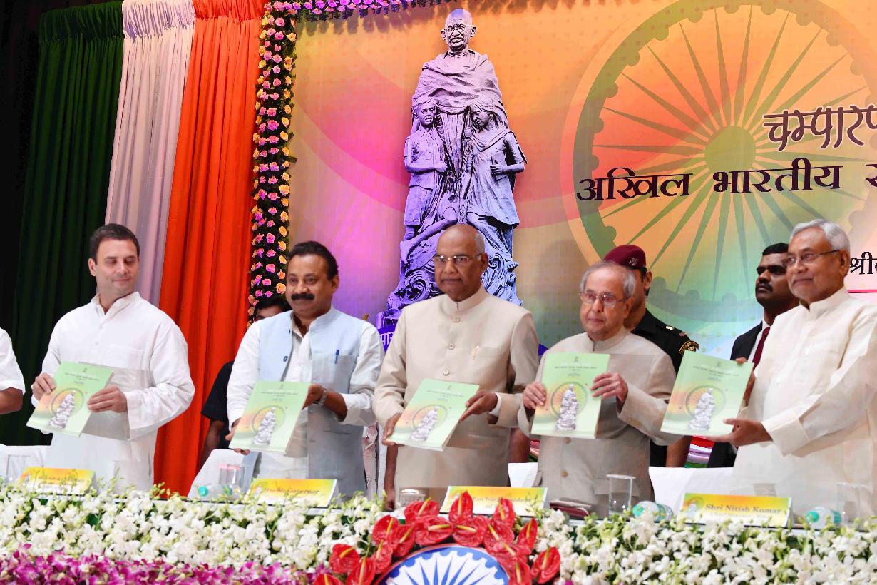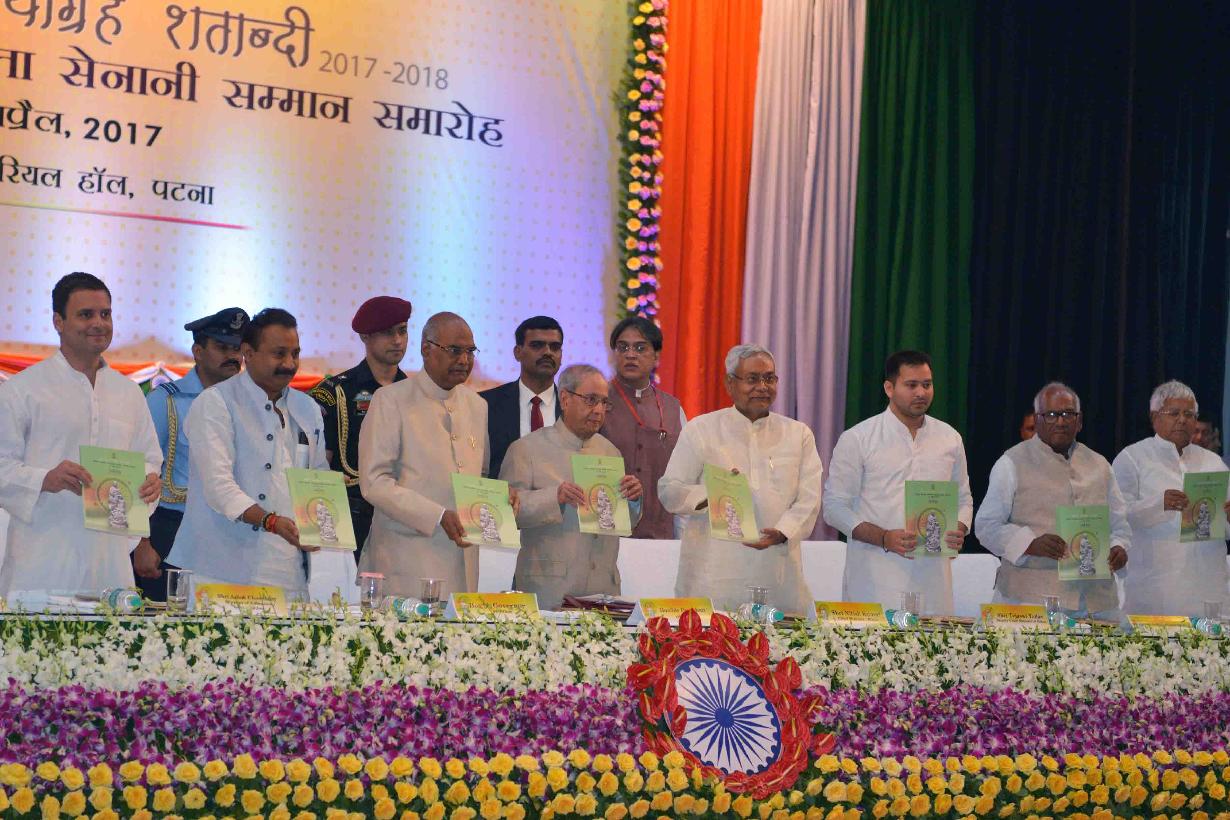 | Caption: | The Governor of Bihar, Shri Ram Nath Kovind releasing the Souvenir relating to Freedon Fighters and presented first copy to the President of India, Shri Pranab Mukherjee, at the Felicitation Ceremony on the occasion of Centenary of Mahatma Gandhi's Champaran Satyagraha, at Patna, in Bihar on April 17, 2017. |