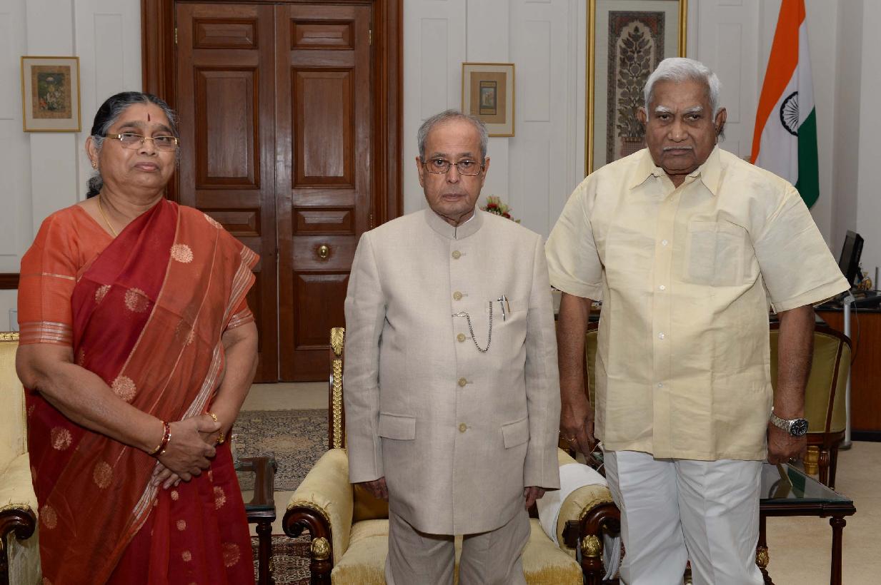 | Caption: | The President of India, Shri Pranab Mukherjee meeting with Shri Palavai Govardhan Reddy, MP (RS) along with his wife Smt. Palavi Srujamani, at Rashtrapati Bhavan on May 02, 2017. |
