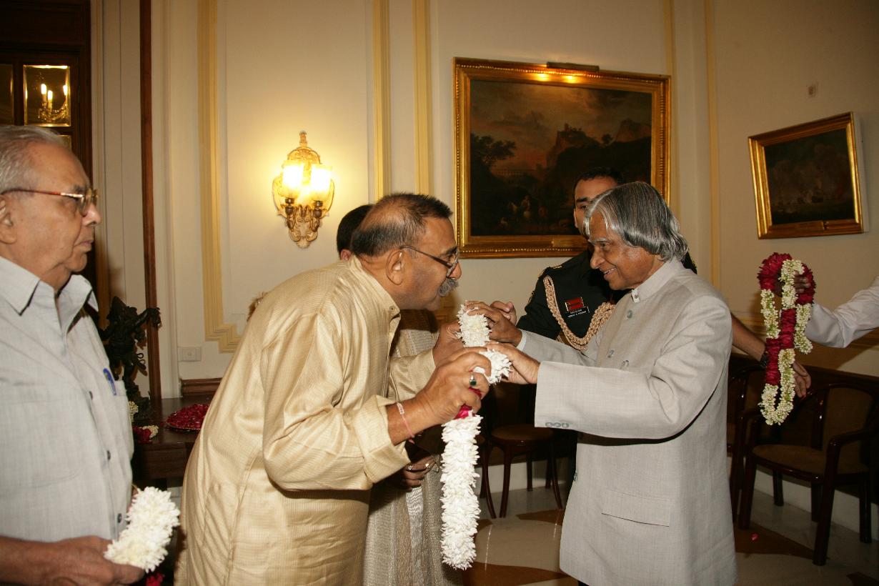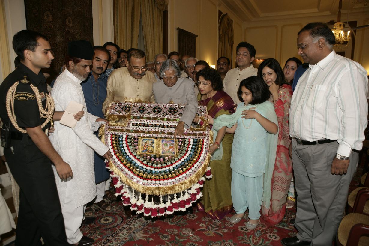 | Caption: | The President of India, Dr A P J Abdul Kalam receiving a Pankha of Phool Walon Ki Sair organized by Anjuma Sair-e-Gul-Faroshan at the Yellow Drawing Room of Rashtrapati Bhavan in New Delhi on Oct 31, 2006 |