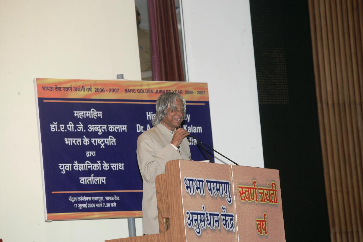 | Caption: | The President of India, Dr A P J Abdul Kalam addressing to the Bhabha Atomic Research Centre (BARC) Trainee Scientists and other Young Scientists at Trombay, Mumbai in Maharashtra on July 17, 2006 |