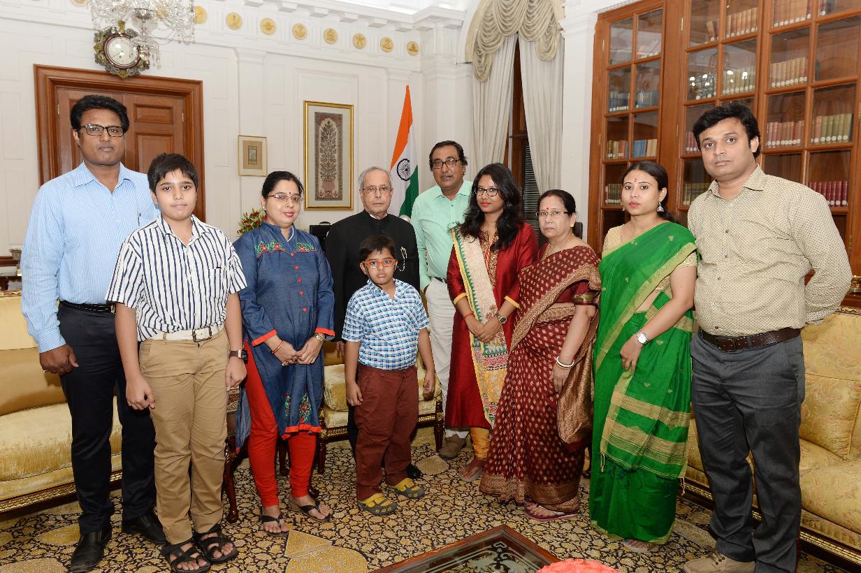 | Caption: | The President of India, Shri Pranab Mukherjee meeting with Shri Mukti Prasad Dhar alongwith his family members from Jangipur, at Rashtrapati Bhavan on May 30, 2017. |