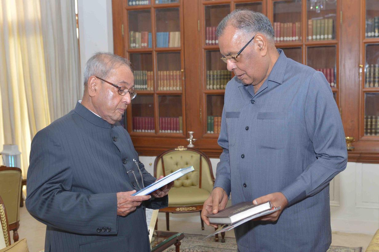 | Caption: | The President of India, Shri Pranab Mukherjee receiving the books ''Sukhi Jeevan'' and ''Indian Culture-Encylopedic Survey-in 8 volumes from Prof. Bithal Das Mundhra, Chairman, Bharatiya Vidya Mandir, Kolkata, at Rashtrapati Bhavan on June 08, 2017. |