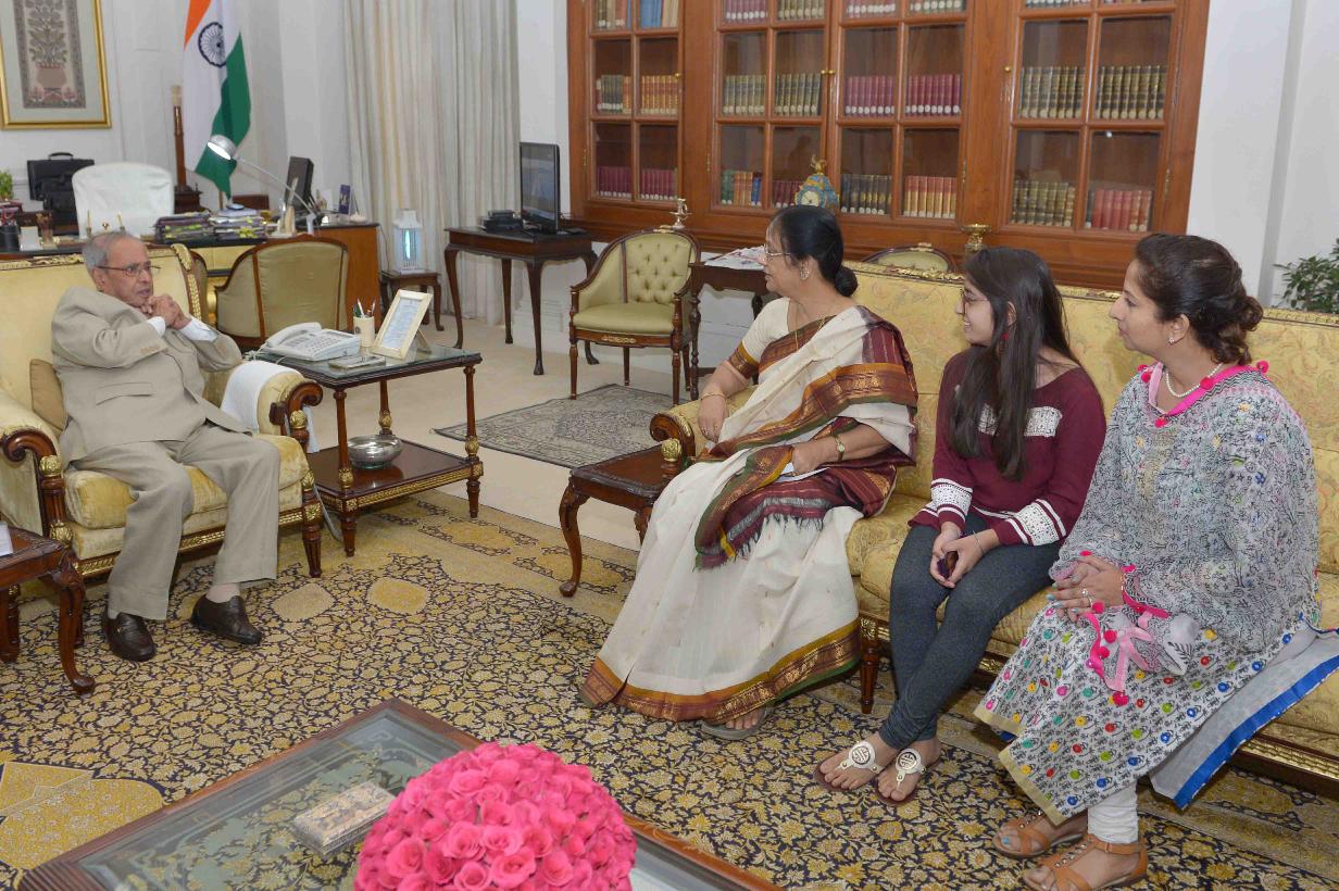 | Caption: | The President of India, Shri Pranab Mukherjee meeting with Smt. Malaya Malik, wife of late Dr. K.C. Malik along with her daughter Ms. Indrani Choudhary and grand-daughter Ms. Shreya Choudhary, at Rashtrapati Bhavan on May 31, 2017. |